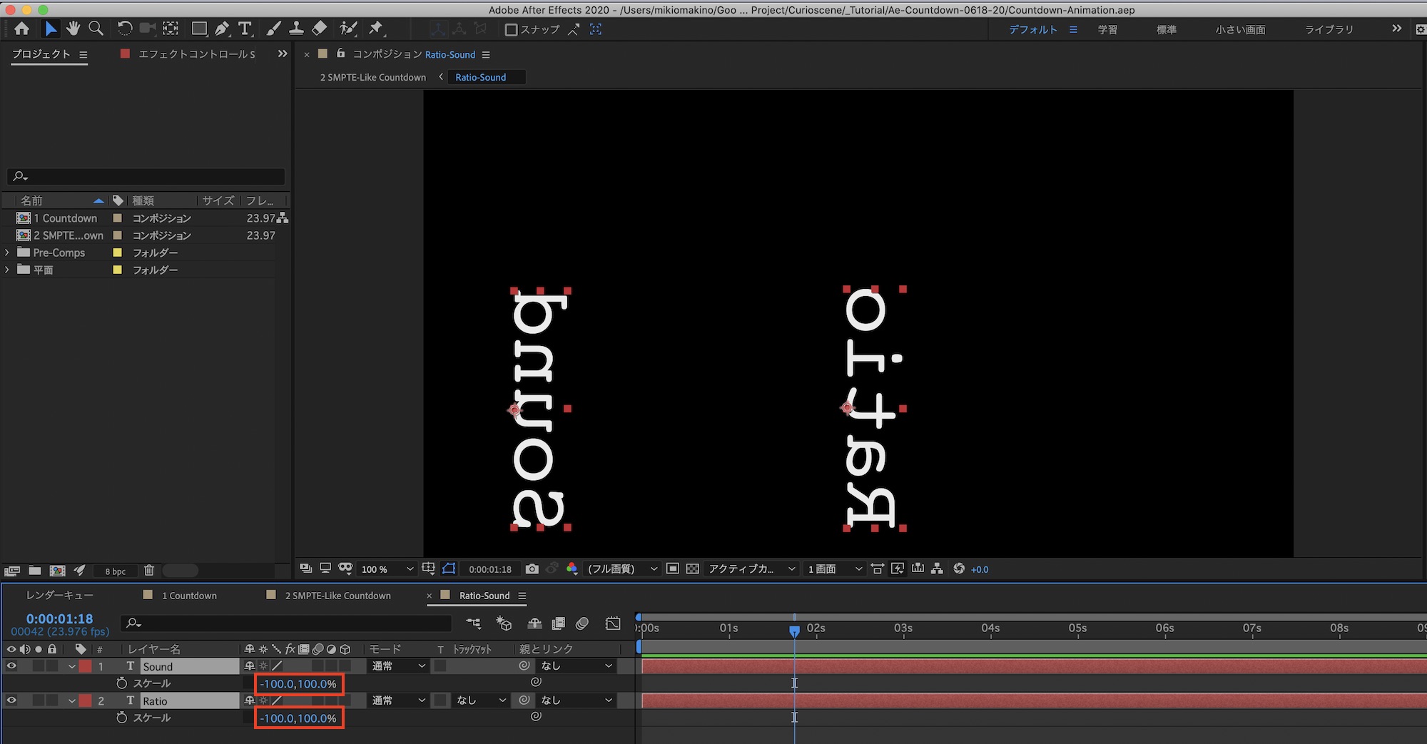 文字を反転したい場合はテキストレイヤーの「スケール」を開き、鎖アイコンを外して「-100%」のようにすれば出来ます。