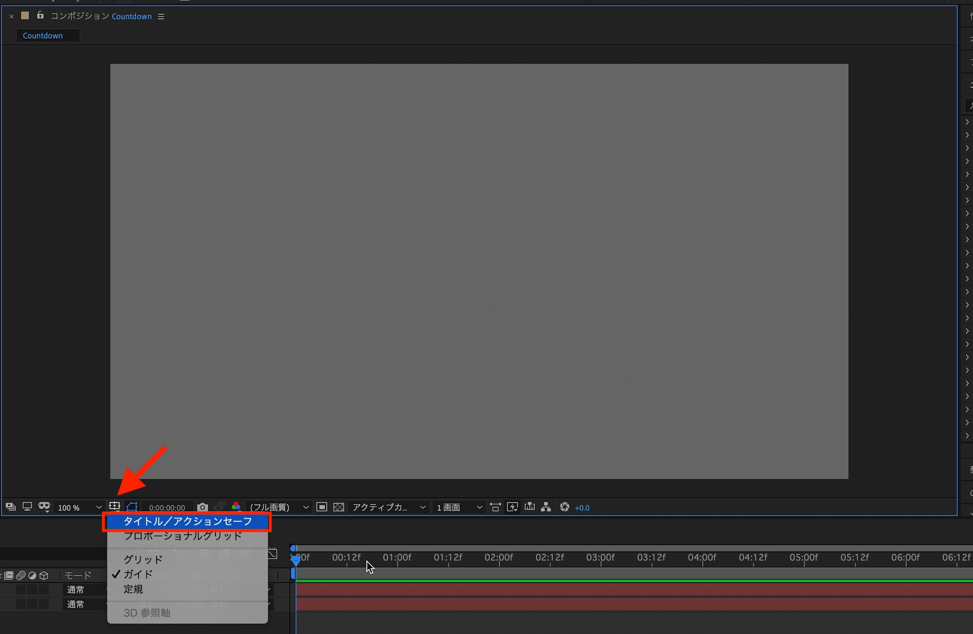 コンポジション左下にある「タイトル/アクションセーフ」を表示させながら作業すると便利です。