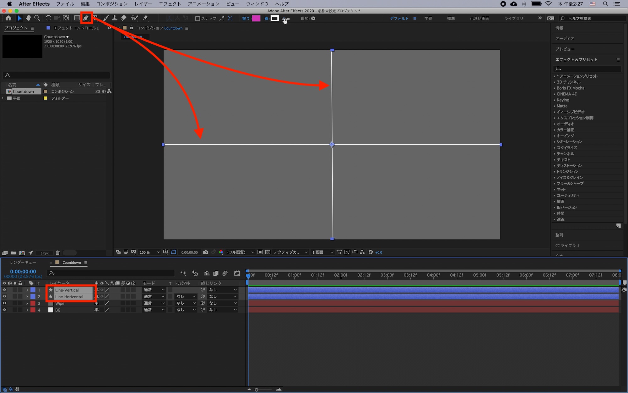 上部メニューの「レイヤー」、「新規」の「シェイプレイヤー」からペンツールを使い、縦横の線を追加していきましょう。