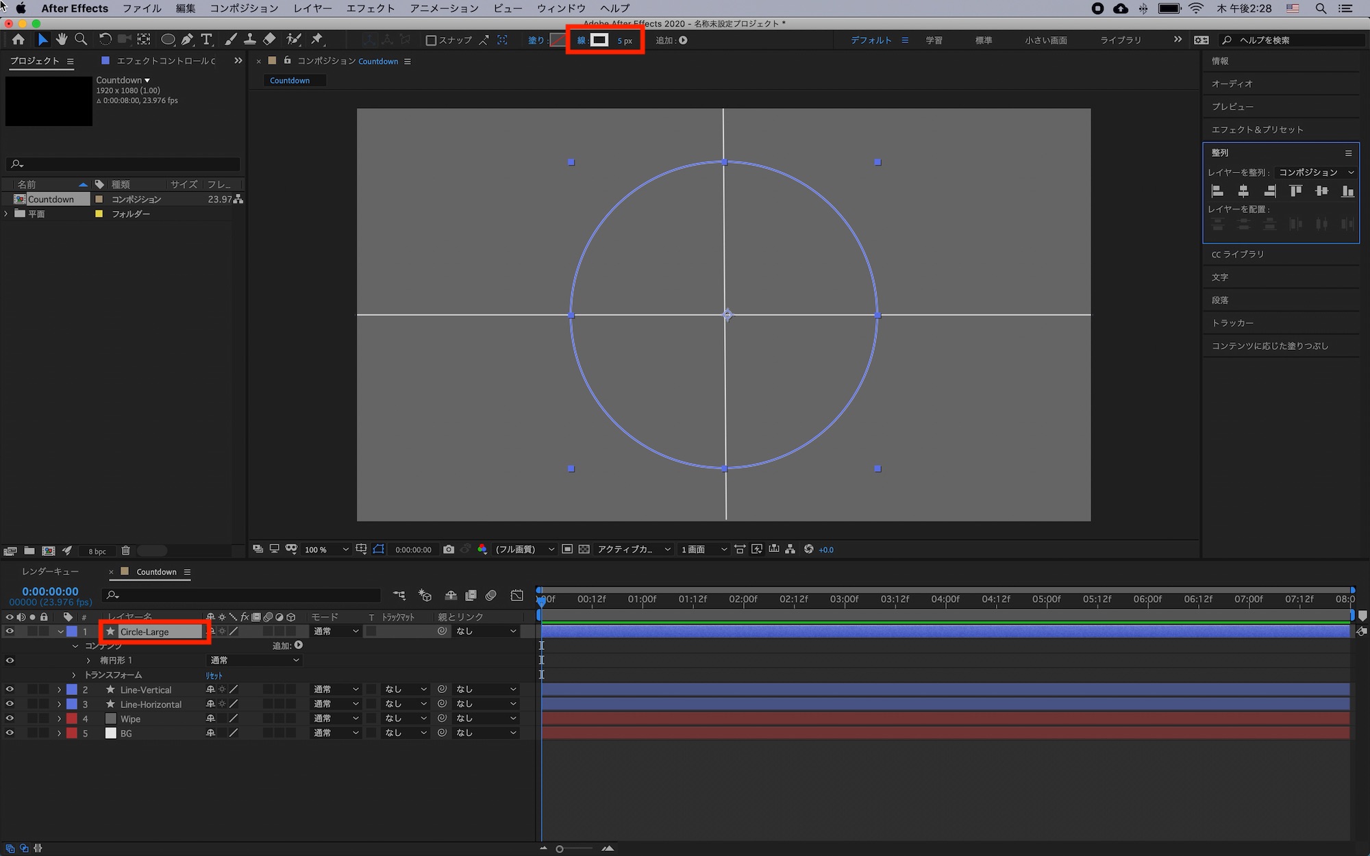 塗りは必要ないのでオフにして、線を「5px」に指定し、レイヤー名を「Circle-Large」に変更しましょう。