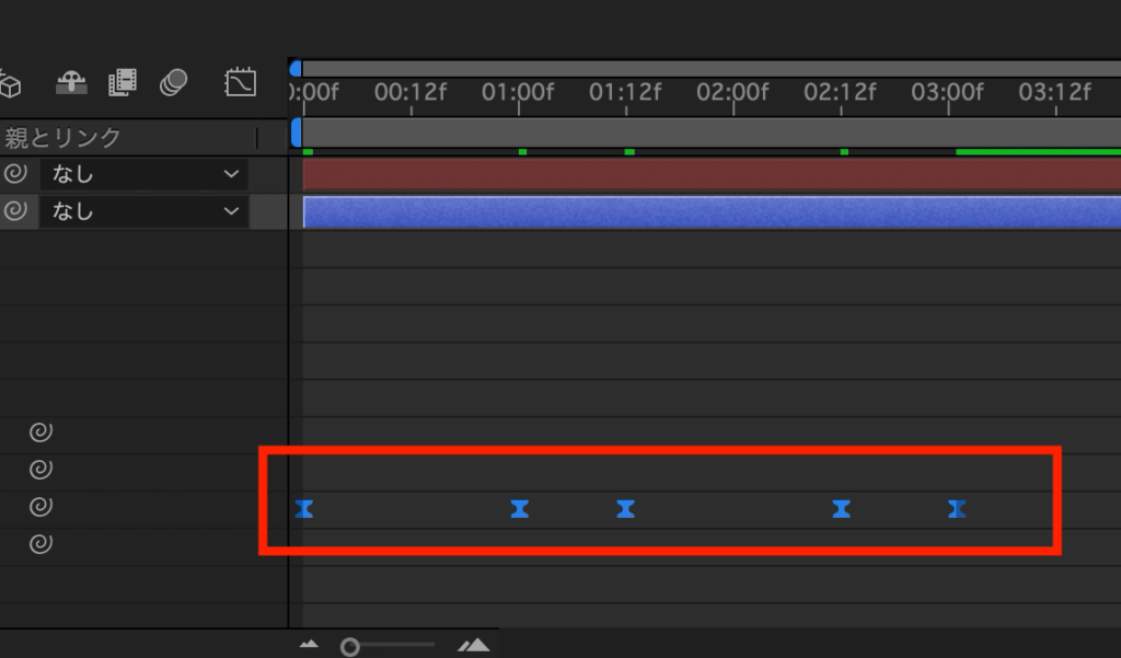 そこから数秒タイムインディケーターを動かし、またひし形アイコンをクリックして、同じキーフレームを追加。