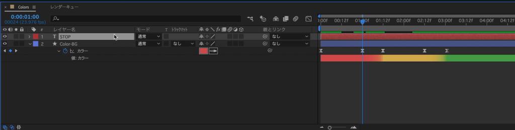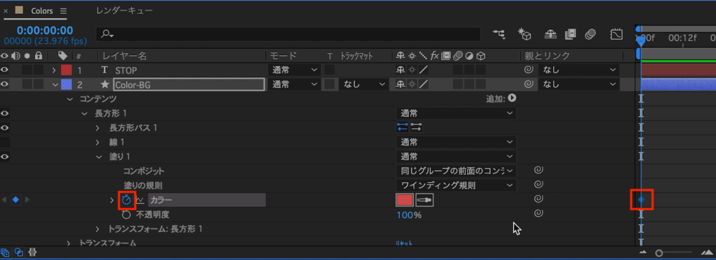 中に「カラー」とあるのですが、すぐ横にストップウォッチアイコンが表示されているので、キーフレームを指定して色を変更できるようになります。色を変えたいタイミングに合わせてキーフレームを追加していくと良いでしょう。