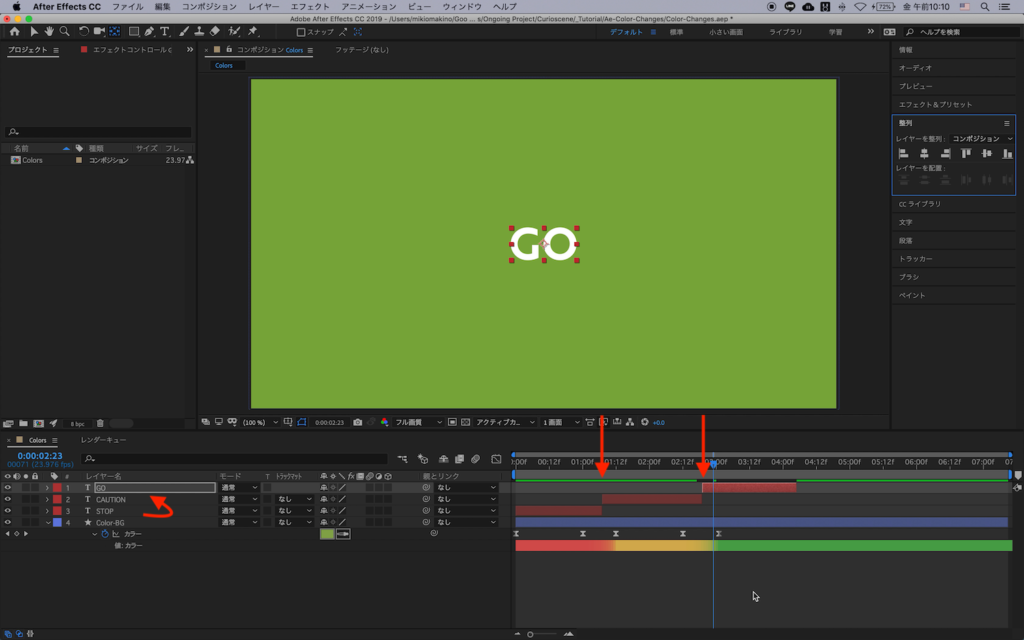 もし今回のチュートリアルと全く同じ様に作りたい場合は、「STOP」の文字を複製し、色が変わるタイミングにそれぞれ「CAUTION」、「GO」のテキストを追加してみてください。