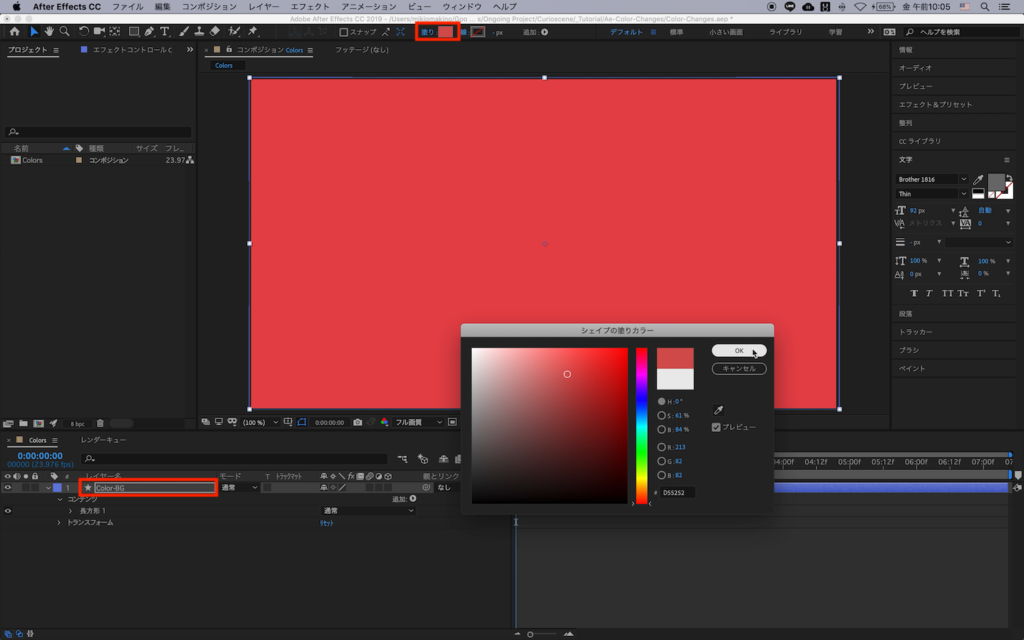 わかりやすいようにシェイプレイヤーの名前を「Color-BG」のように変更し、上部の「塗り」から好きな色を指定します。