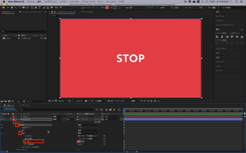 背景部分である「Color-BG」を選択して、左側にある三角アイコンを開き、「コンテンツ」、「塗り1」を展開します。
