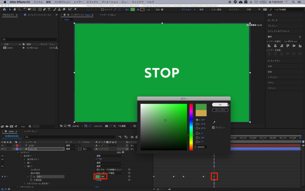 Adobe After Effectsのプロジェクトで出来ればシンプルに設定をそこまで加えずに、スムーズに背景色を変えていきたい!という方はオブジェクトのプロパティにある「カラー」を使用する事でシェイプレイヤーを一つ使用しながら、色を変える事が出来ます。