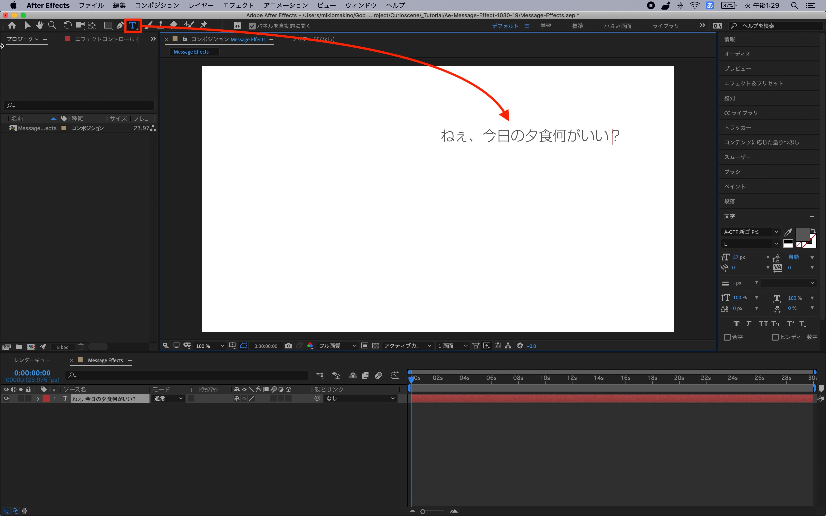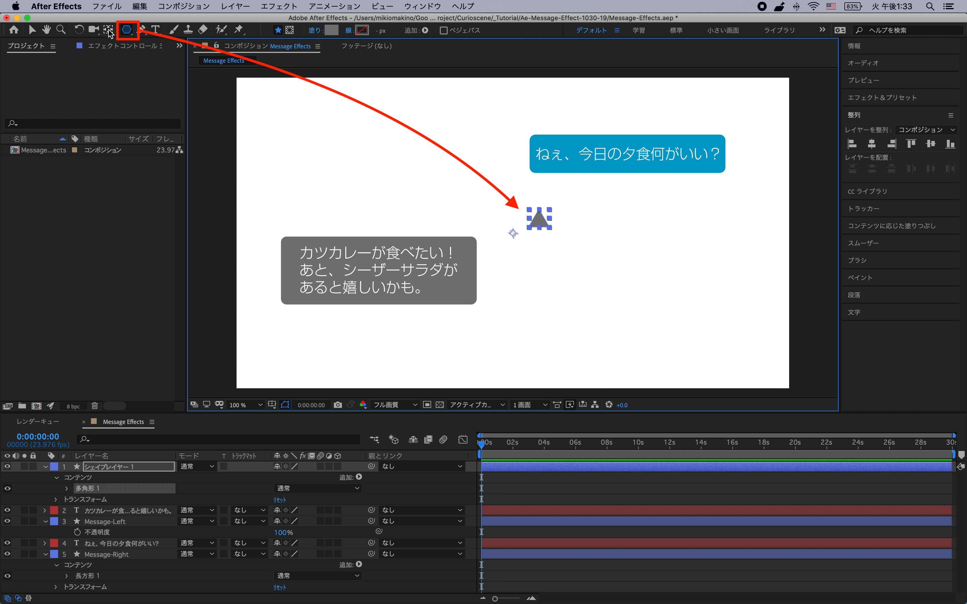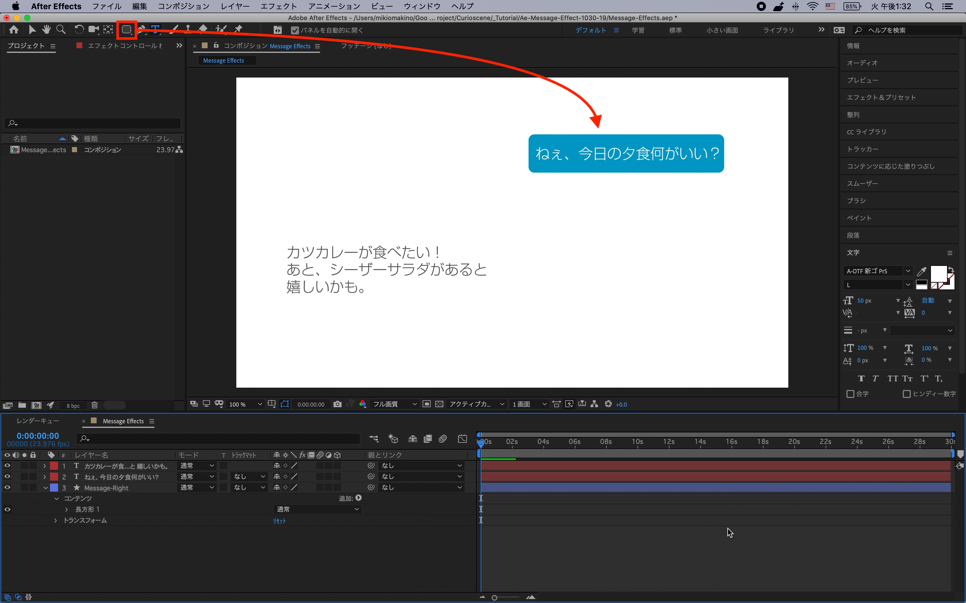 コンポジションを作成した後はテキストツールとシェイプツールを使用してメッセージ画面をデザインしていきます。