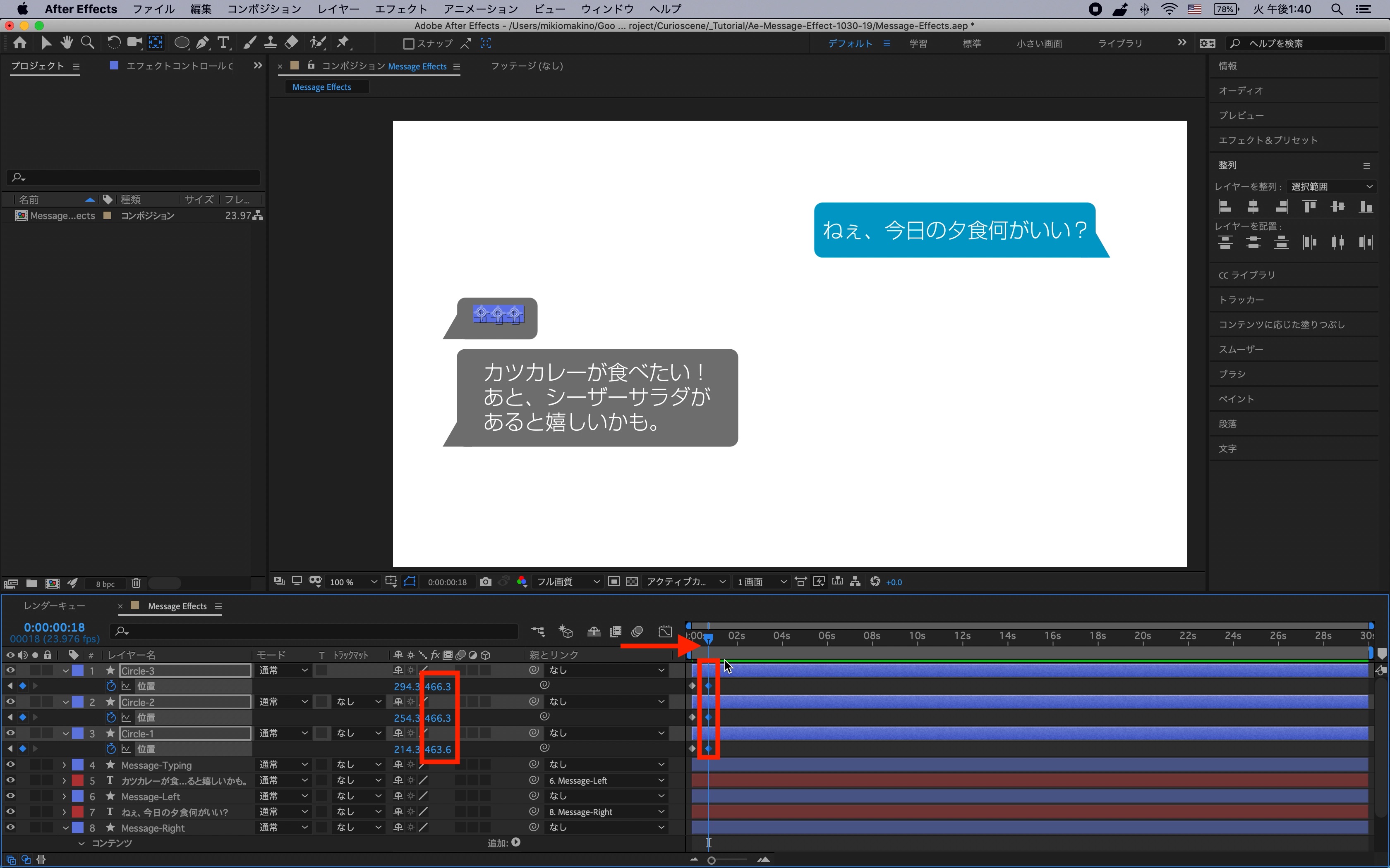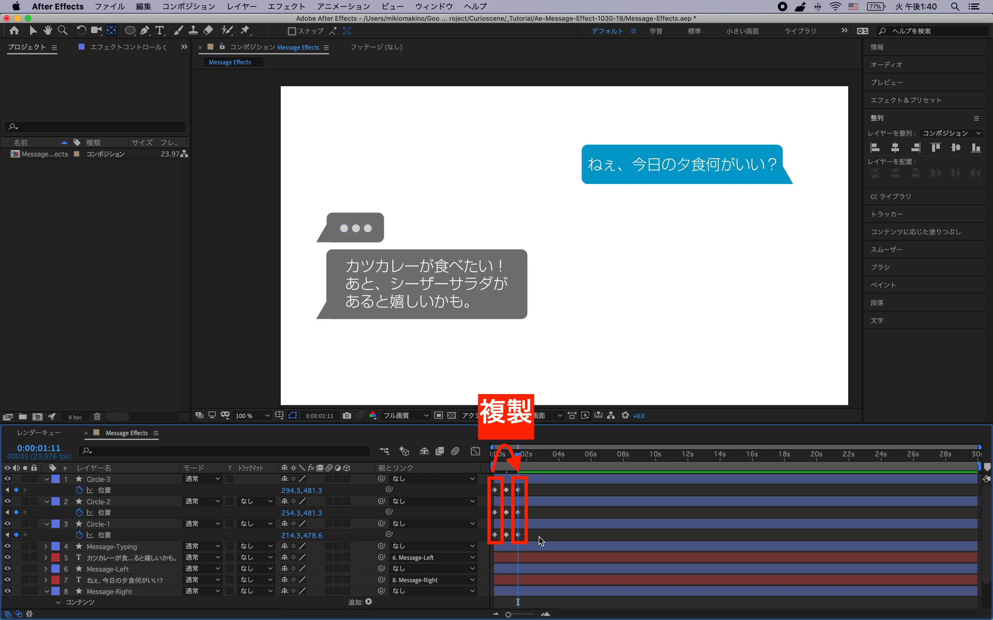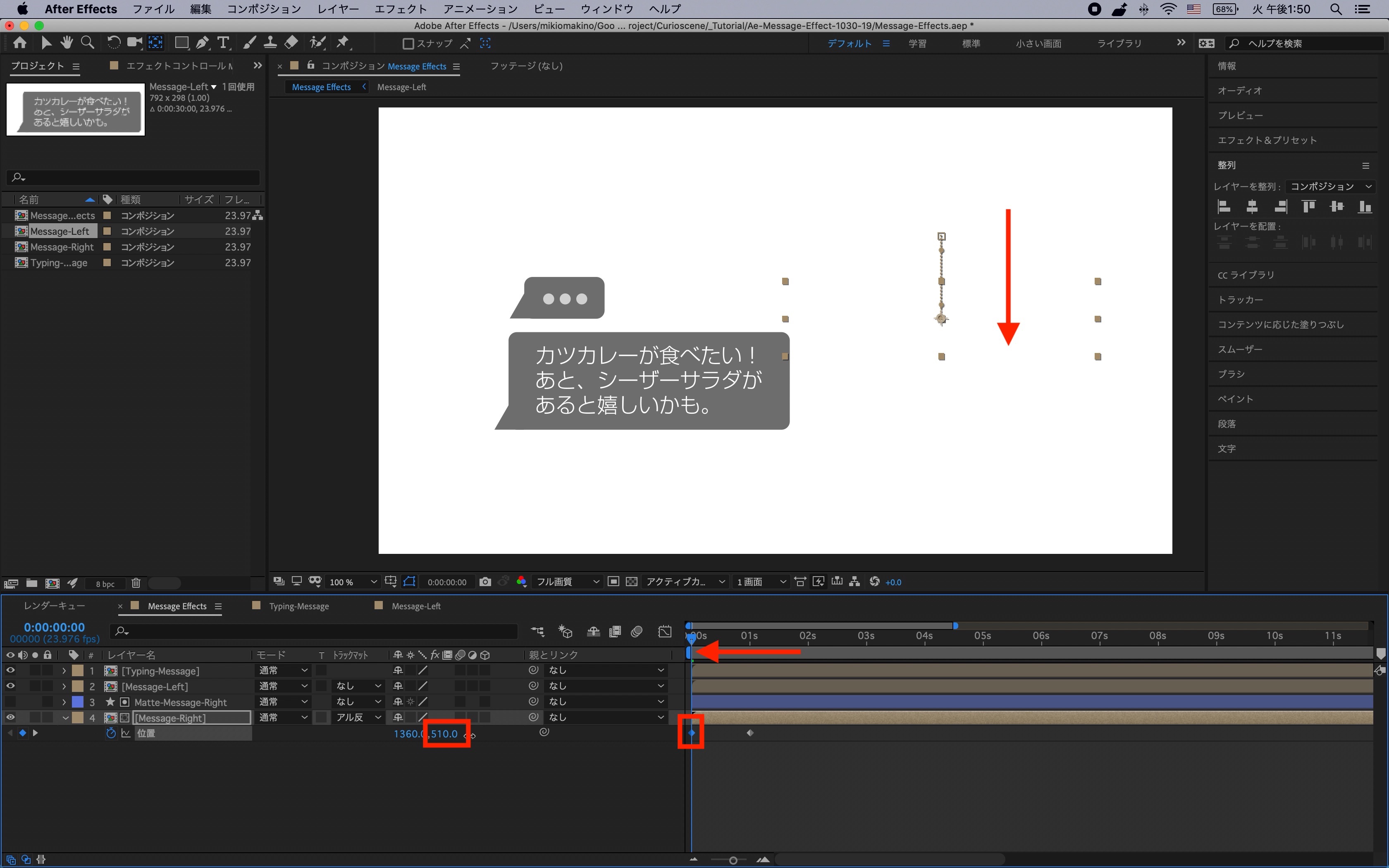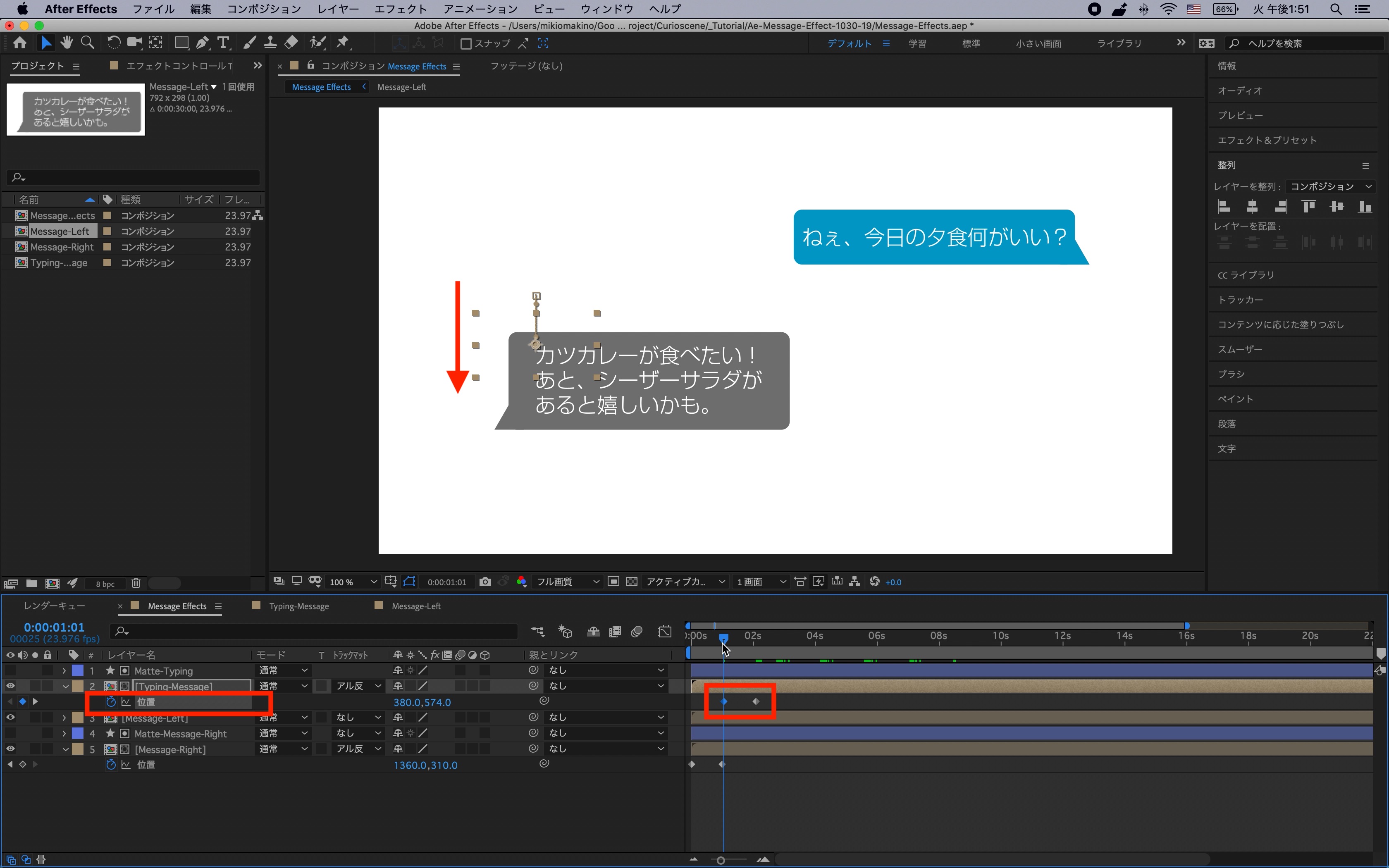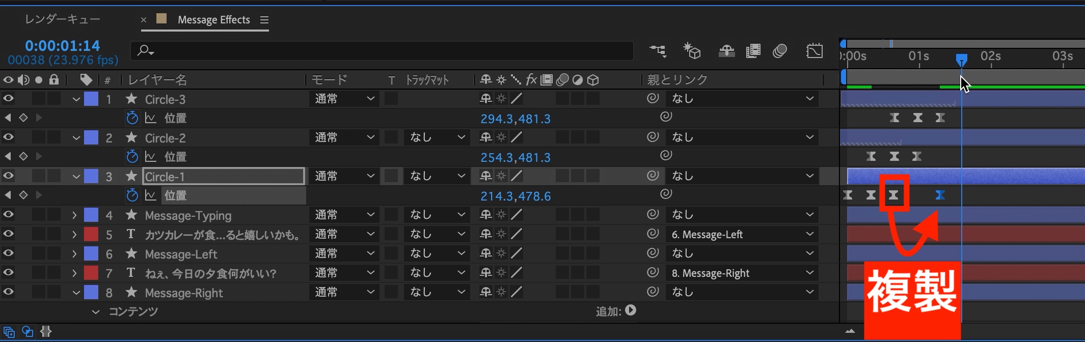 タイムインディケーターを1秒に動かし、右の吹き出し(Message-Right)の「位置」を展開し、ストップウォッチアイコンをクリックして現在の状態をキーフレームに保存します。