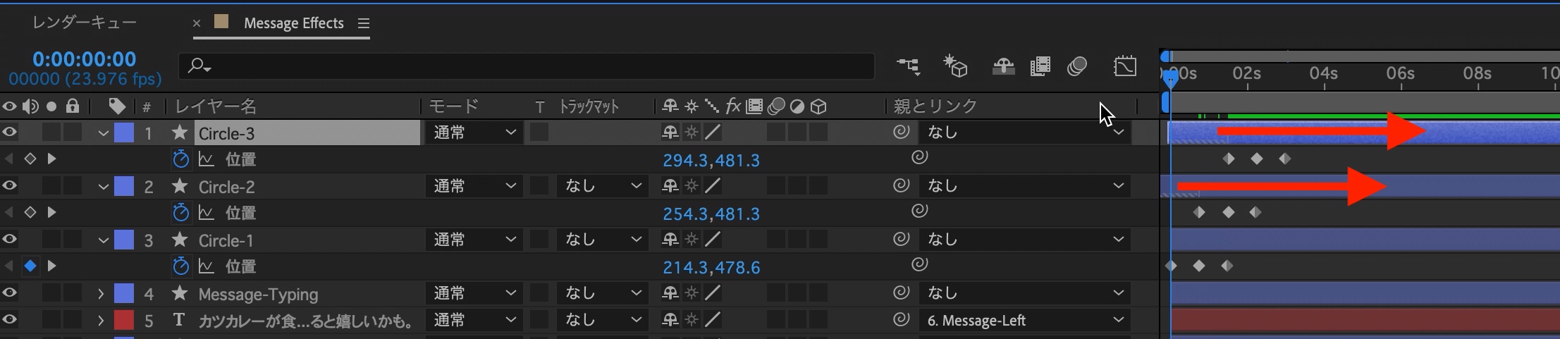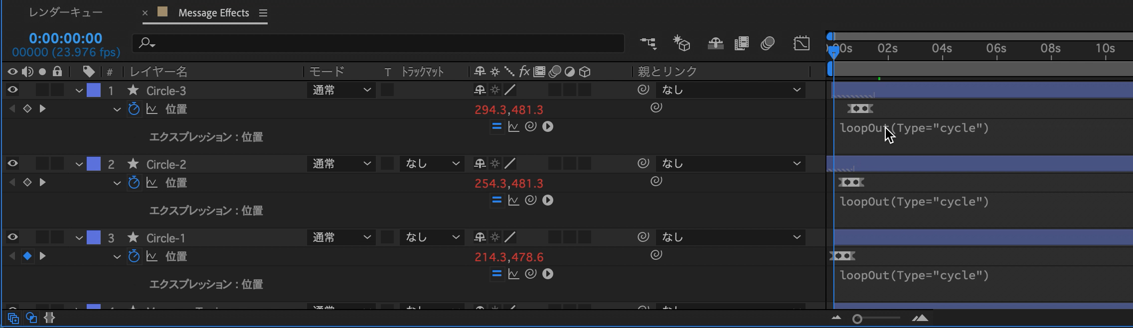 「Circle-1、2、3」レイヤーの「位置」のプロパティを表示し、「Control(macOSはCmd)キー」を押しながらストップウォッチアイコンをクリックします。