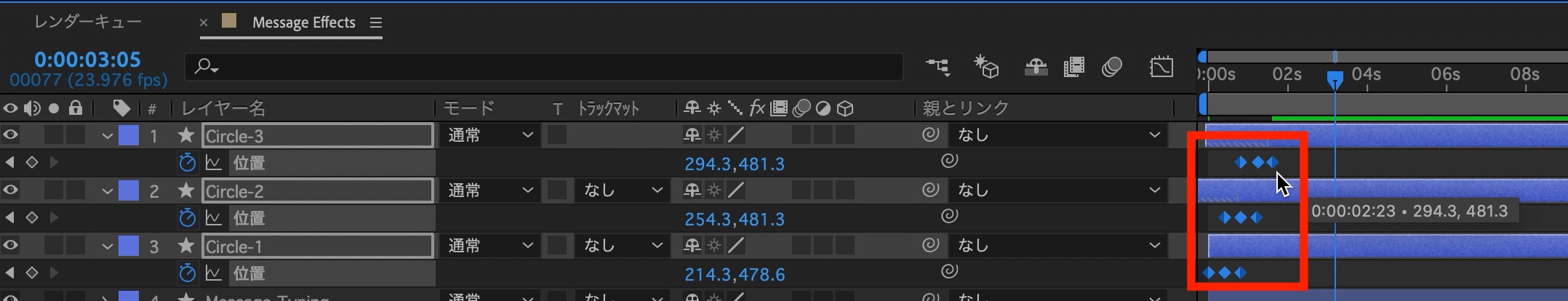 「Circle-1、2、3」のレイヤーを選択し、「位置」のプロパティを開きます。