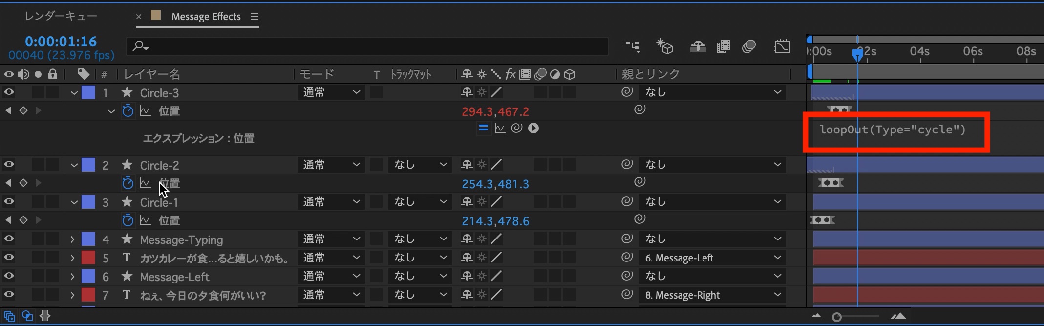 するとエクスプレッションを追加できるテキストエリアが現れるので、「loopOut(Type=“cycle”)」を「Circle-1、2、3」に追加します。