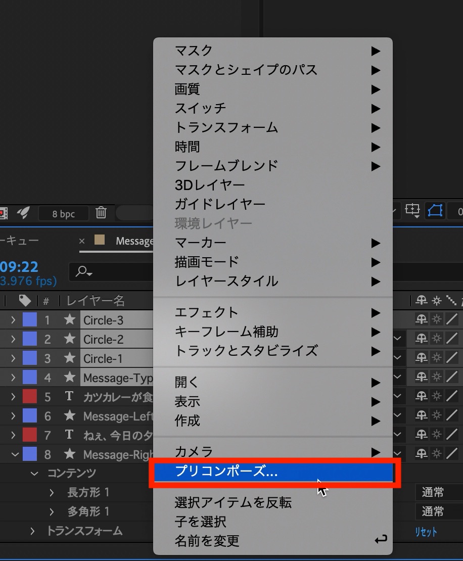 入力中の吹き出しのレイヤーを全て選択して、右クリックの「プリコンポーズ」をクリックして、プリコンポーズさせましょう。