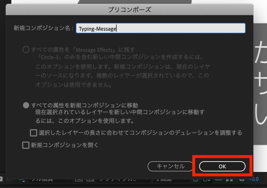 なお、プリコンポーズする際にメッセージの位置がずれるので、再度調整を行なっておきましょう。