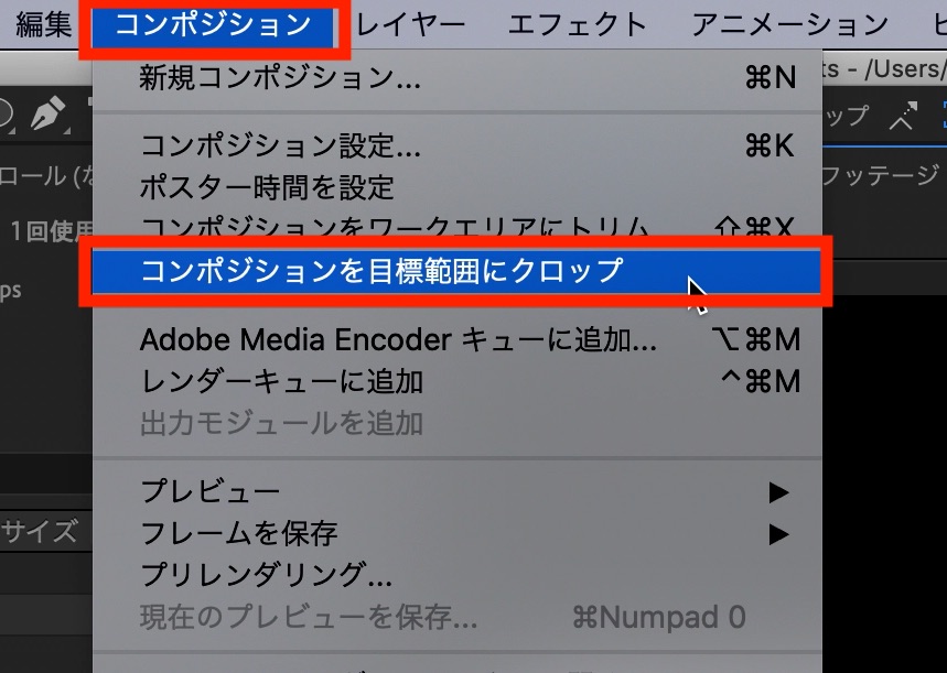 プレビューウィンドウの下にある四角いアイコンをクリックし、コンポジションの目標範囲を指定し、上部メニューの「コンポジション」、「コンポジションを目標範囲にクロップ」をクリックして、サイズを調整します。