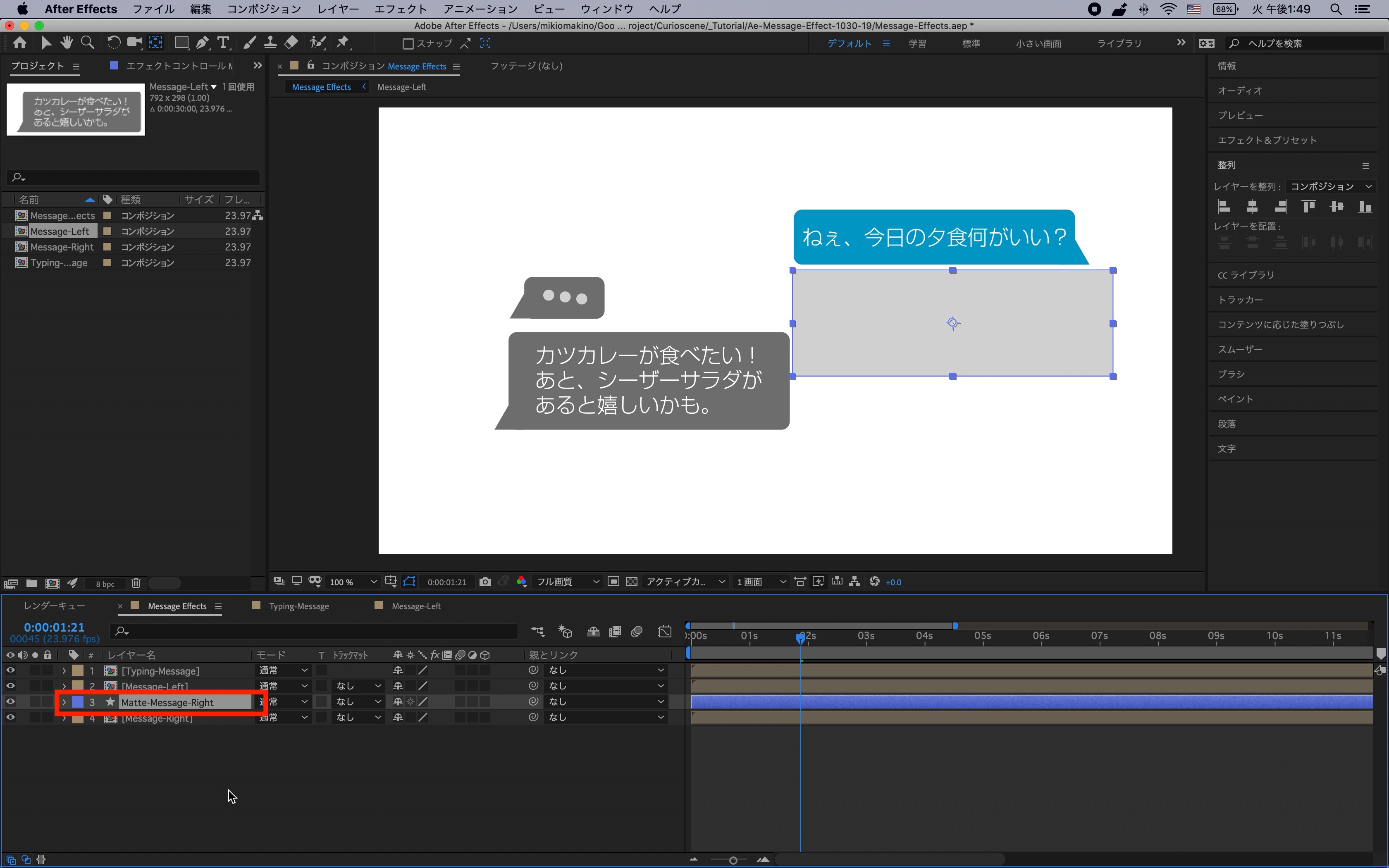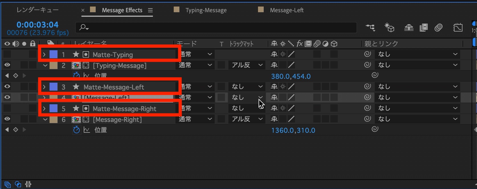 追加したシェイプレイヤーはわかりやすいように「Matte-Message-Right」のように変更しておくと良いかもしれません。