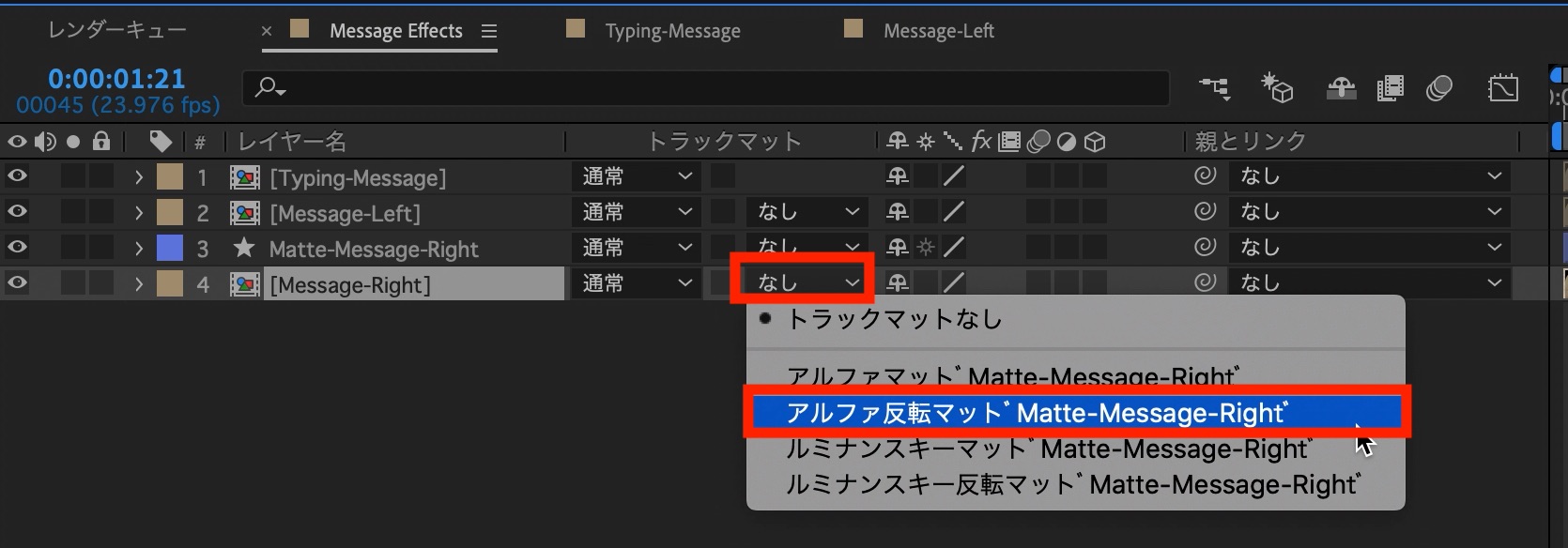 その後は吹き出しのレイヤーにある「トラックマット」の項目から「アルファ反転マット”Matte-Message-Right”」を選択しましょう。