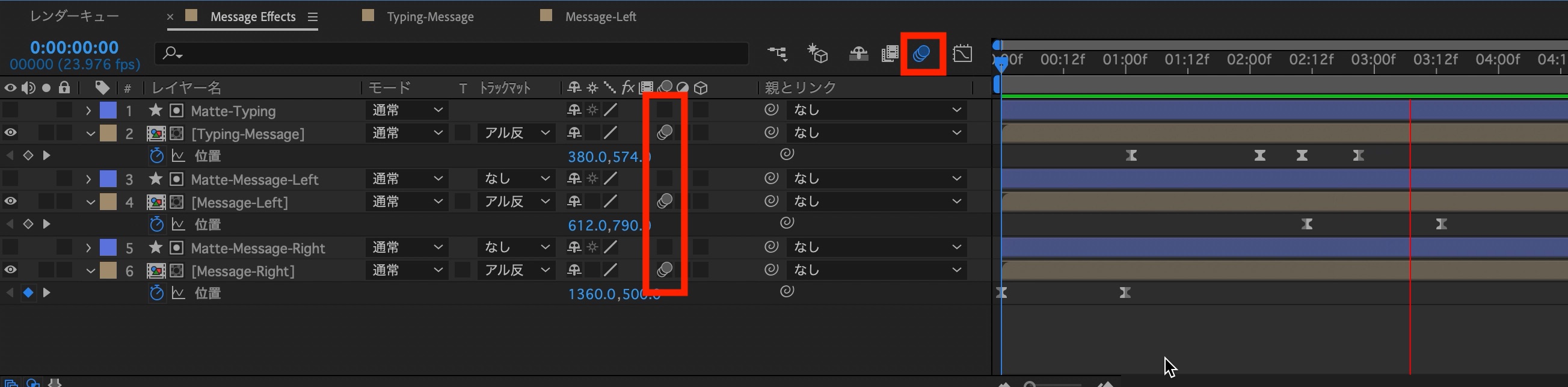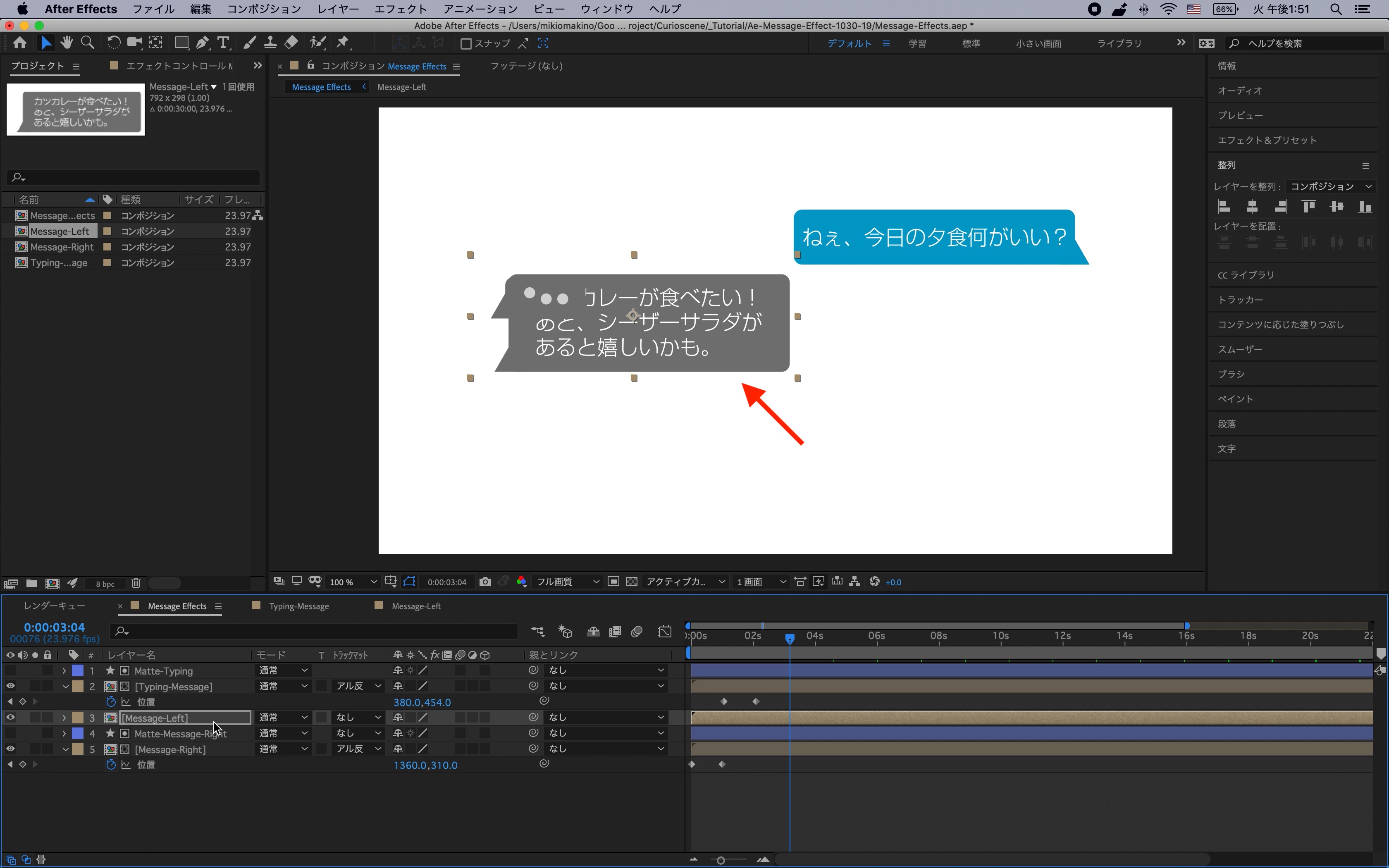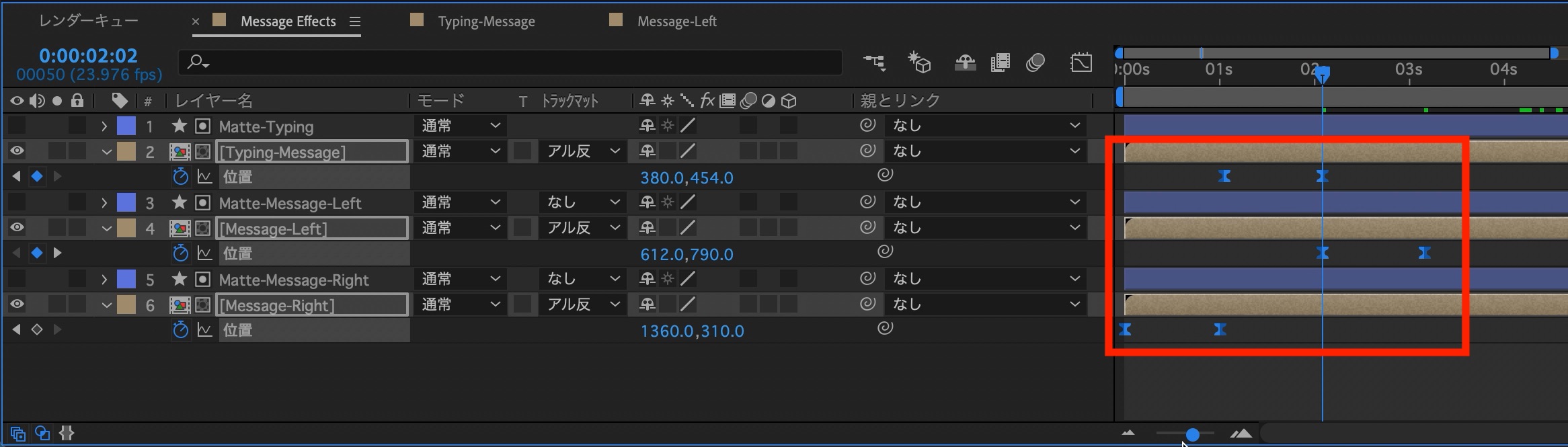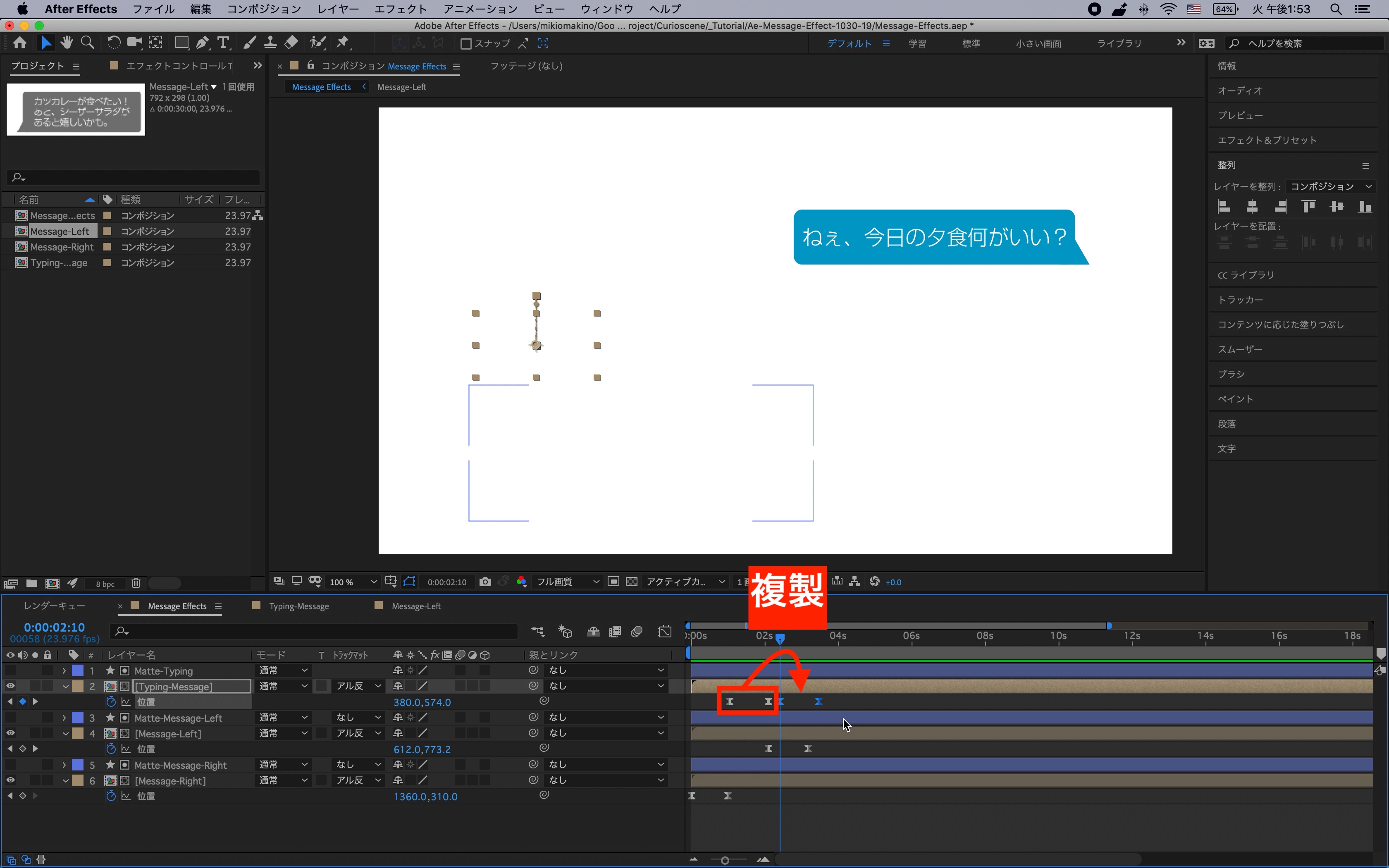 今度は次に現れる吹き出し(Message-Left)が吹き出しと同じ位置に配置されるように、左の吹き出しとマットのシェイプレイヤーを入力中の吹き出しに重なる位置に配置させます。
