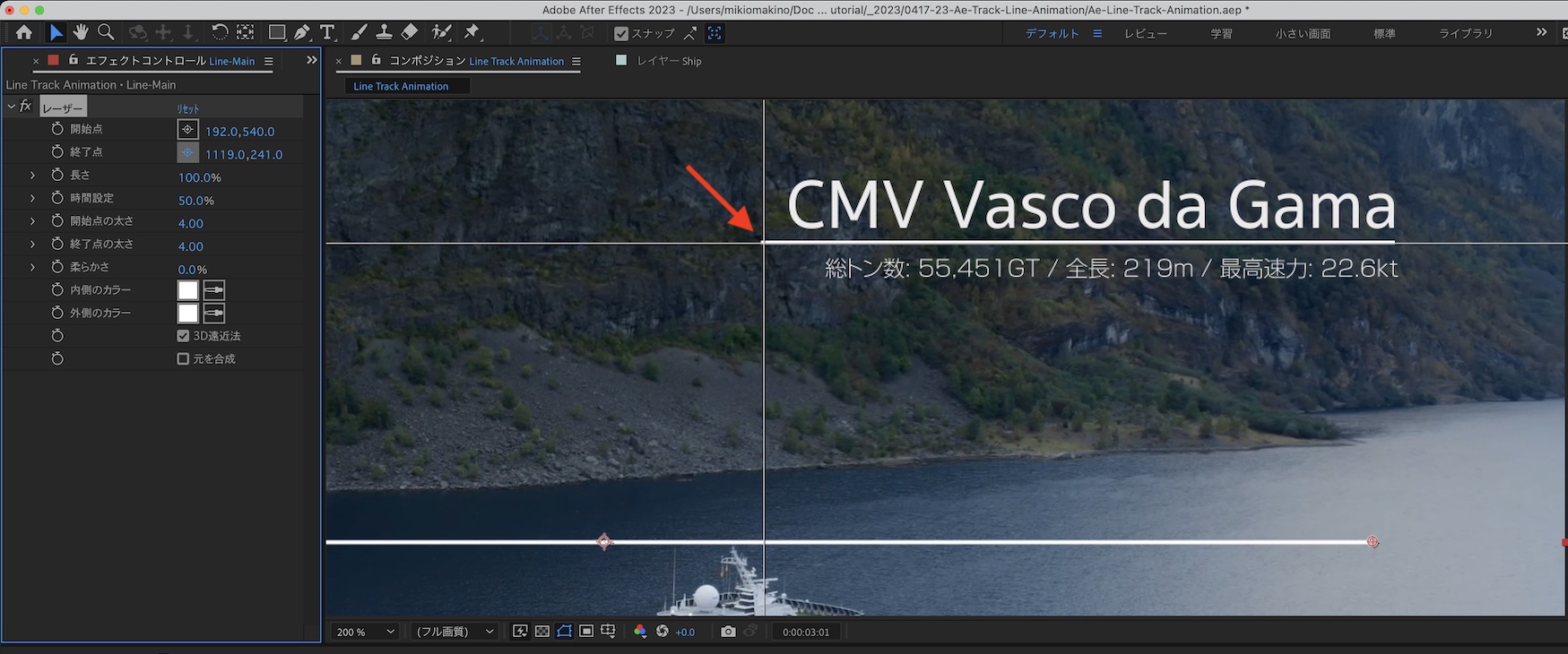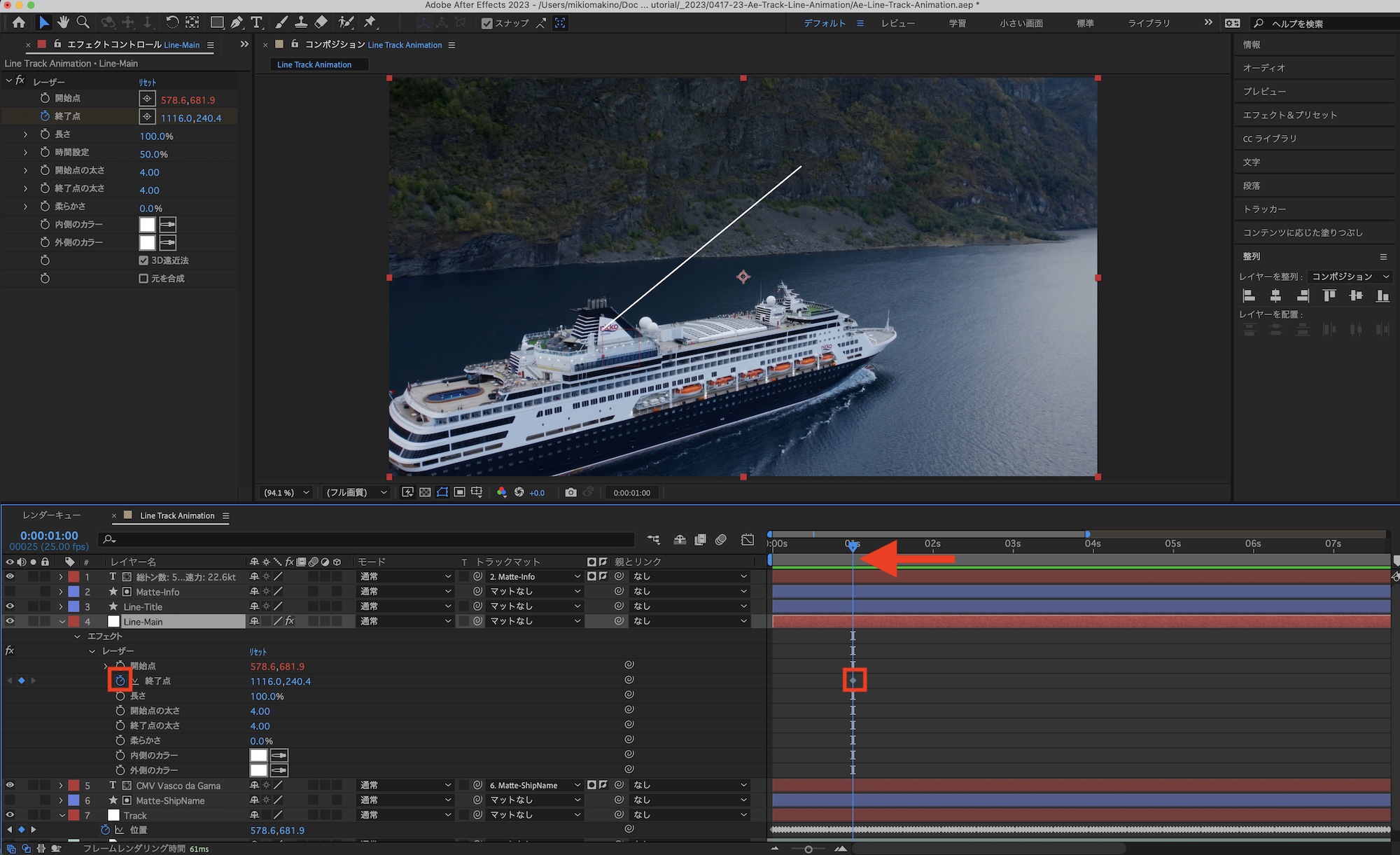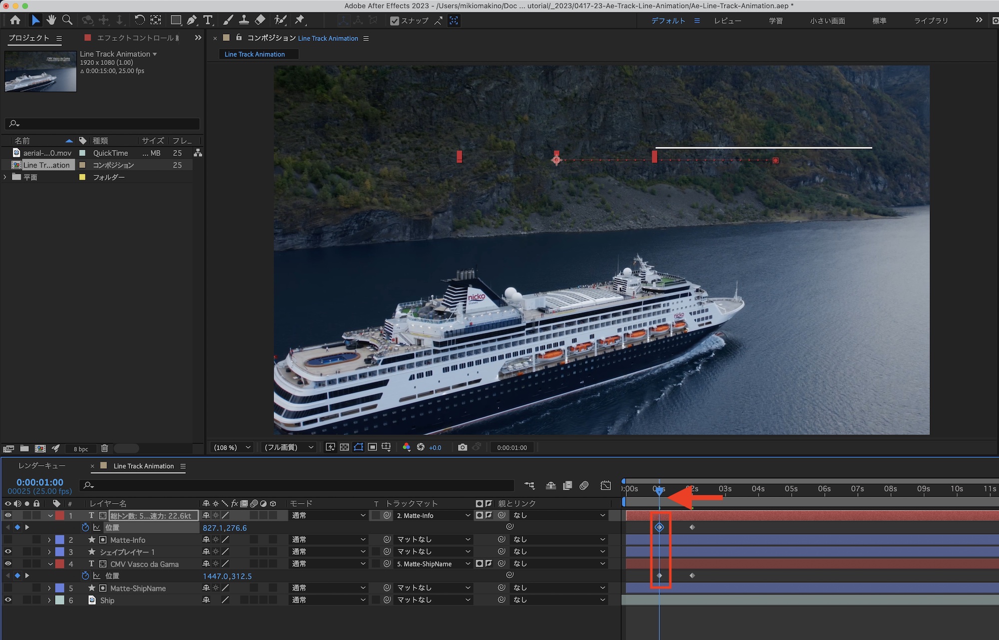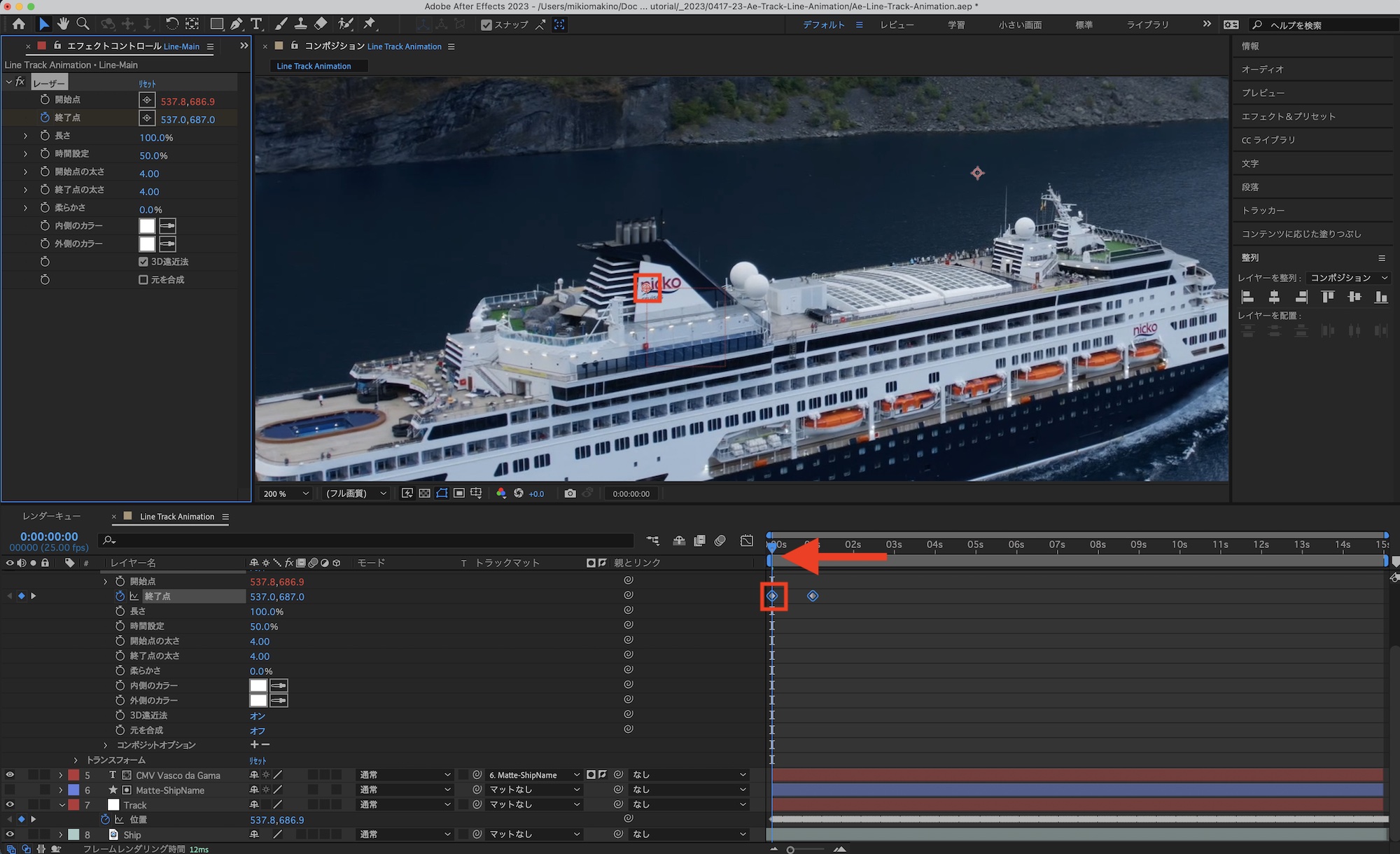 コンポジションを再生してみて、船の動きに合わせて「Line-Main」が動いているか確認してみましょう。筆者の場合は特に問題がなく、煙突の動きに合わせて動かすことができました。