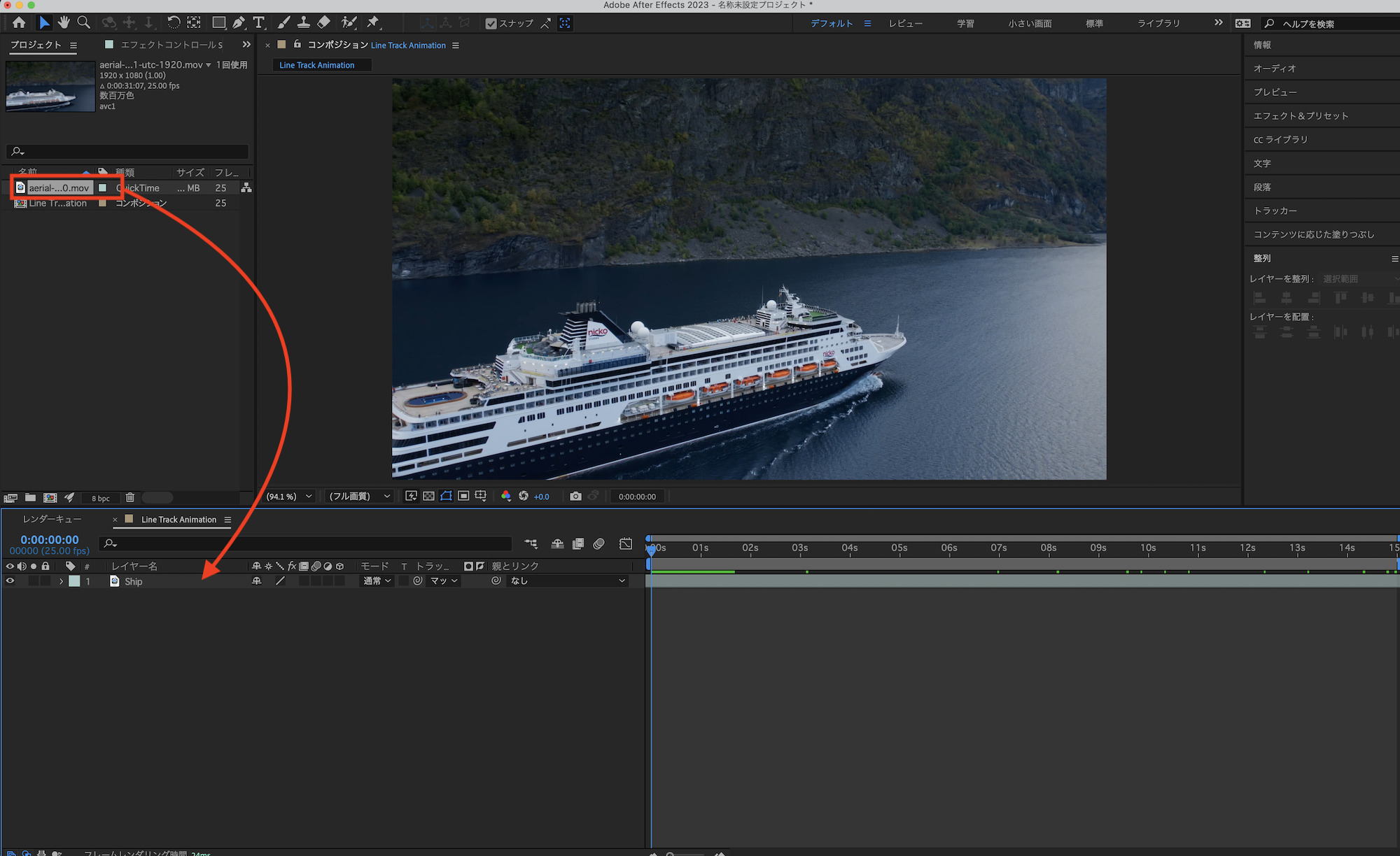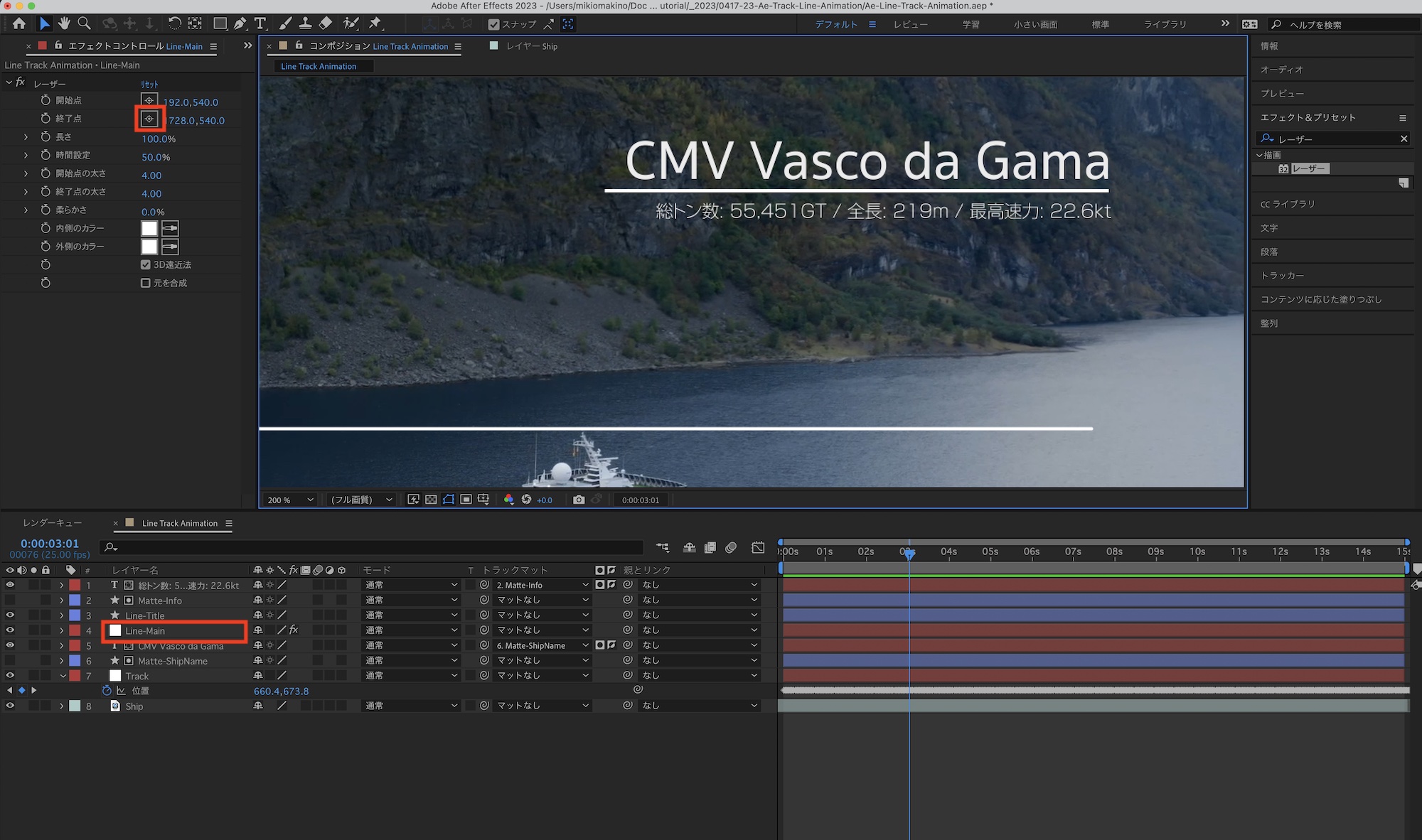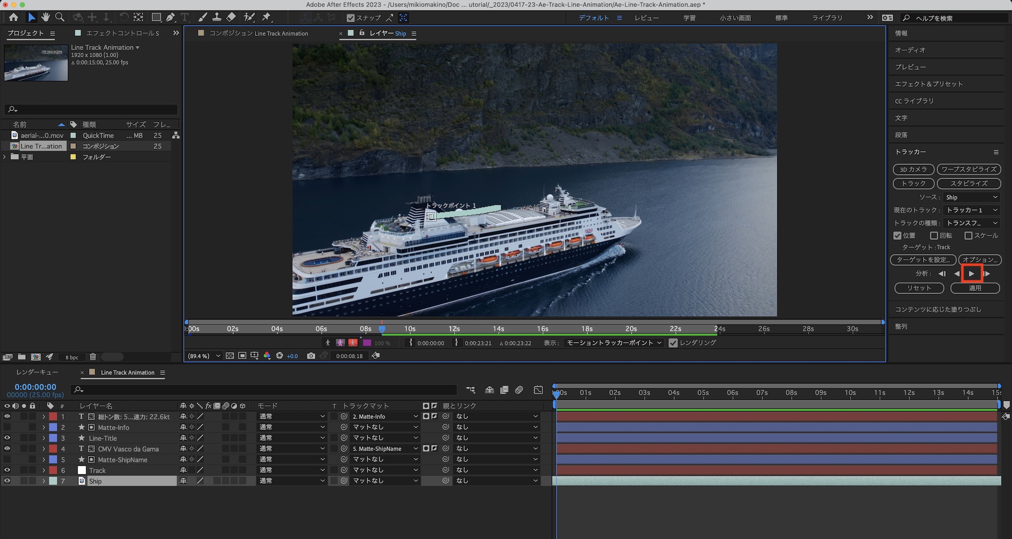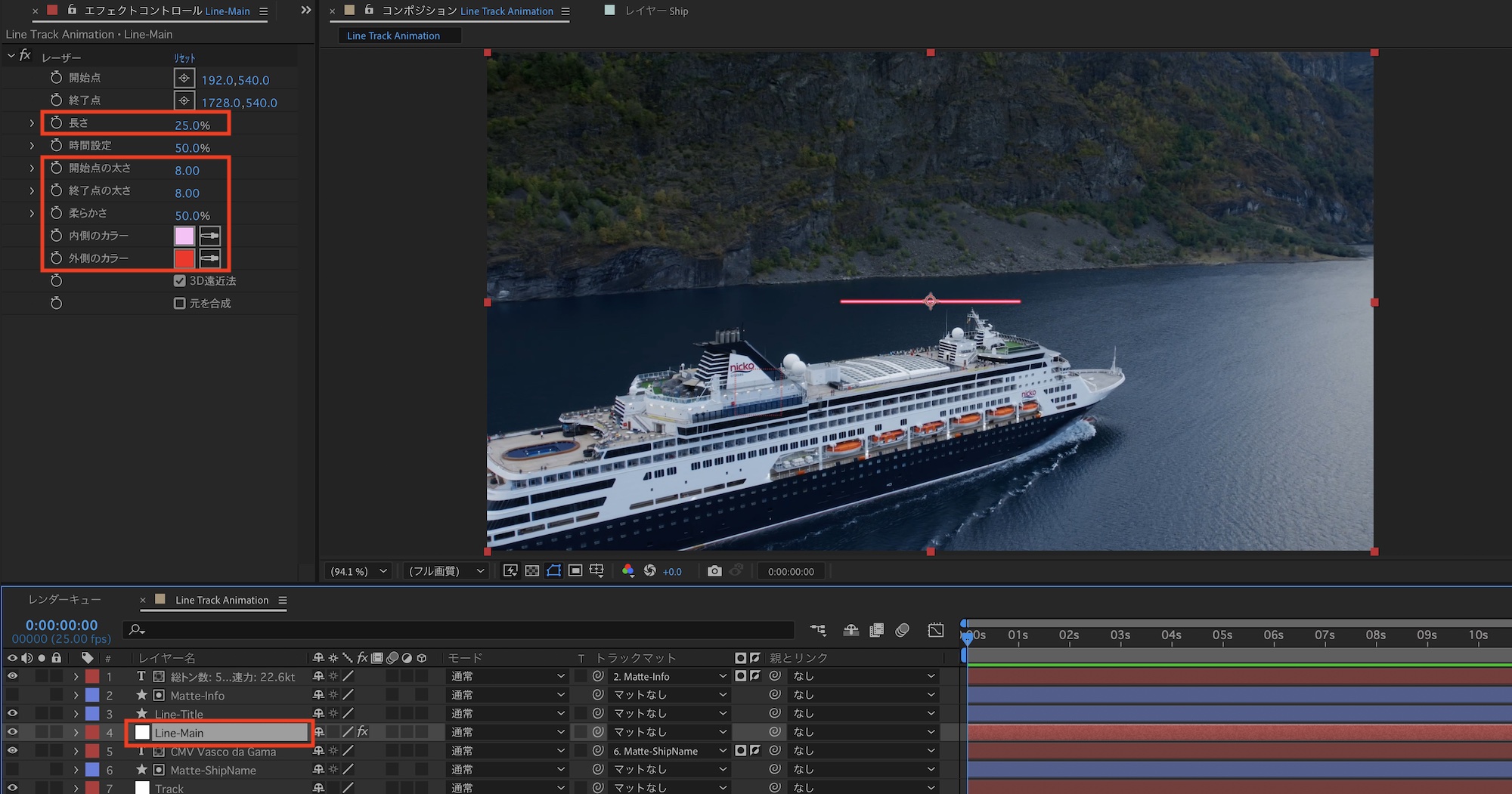 コンポジションを再生してみて、船の動きに合わせて「Line-Main」が動いているか確認してみましょう。筆者の場合は特に問題がなく、煙突の動きに合わせて動かすことができました。