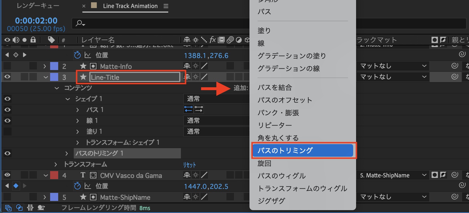 線は「Line-Title」のように名称変更を行い、三角アイコンをクリックして「コンテンツ」の横にある「追加」から「パスのトリミング」を選択してパスのトリミングのパラメータを追加します。