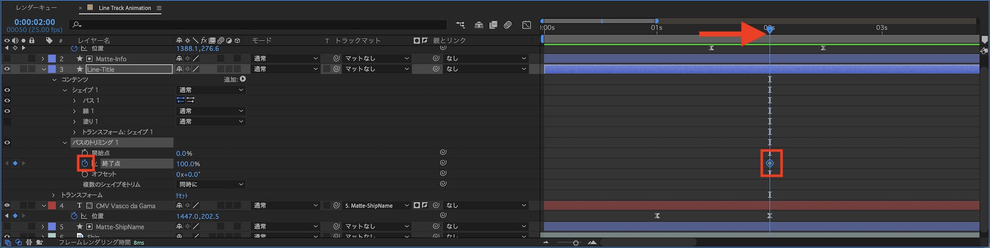 タイムインジケータを「2秒」に動かし、「パスのトリミング」の「終了点」のストップウォッチアイコンをクリックしてキーフレームを追加します。