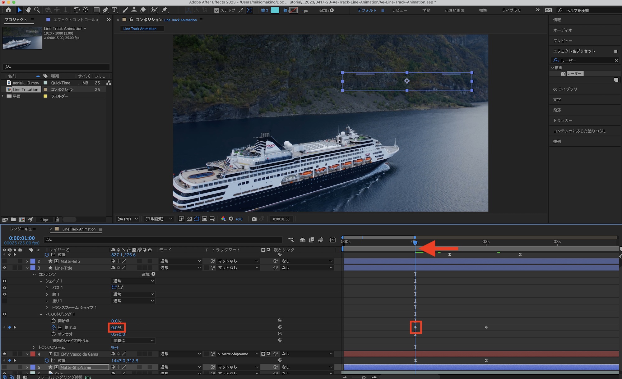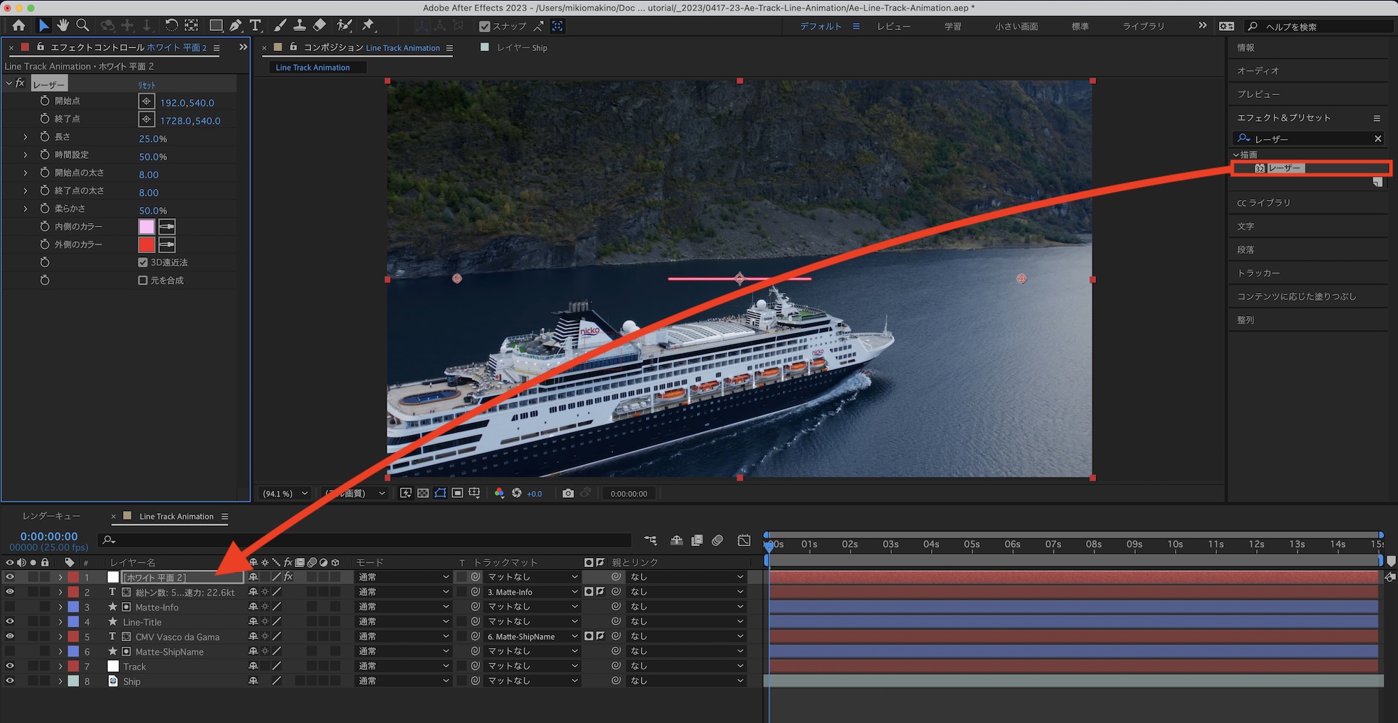 線のアニメーションを組み合わせていきます。先ほど解析したトラッキングは通常の線だと反映できないので、「レーザー」というエフェクトを使って行きます。