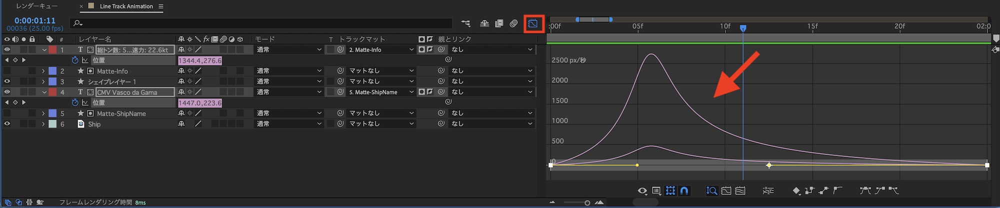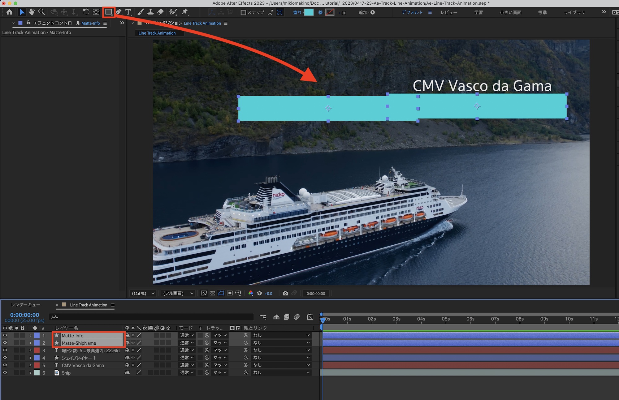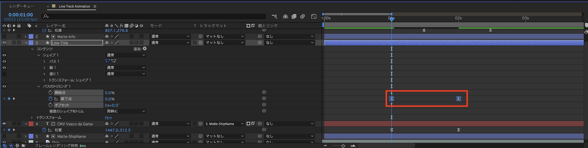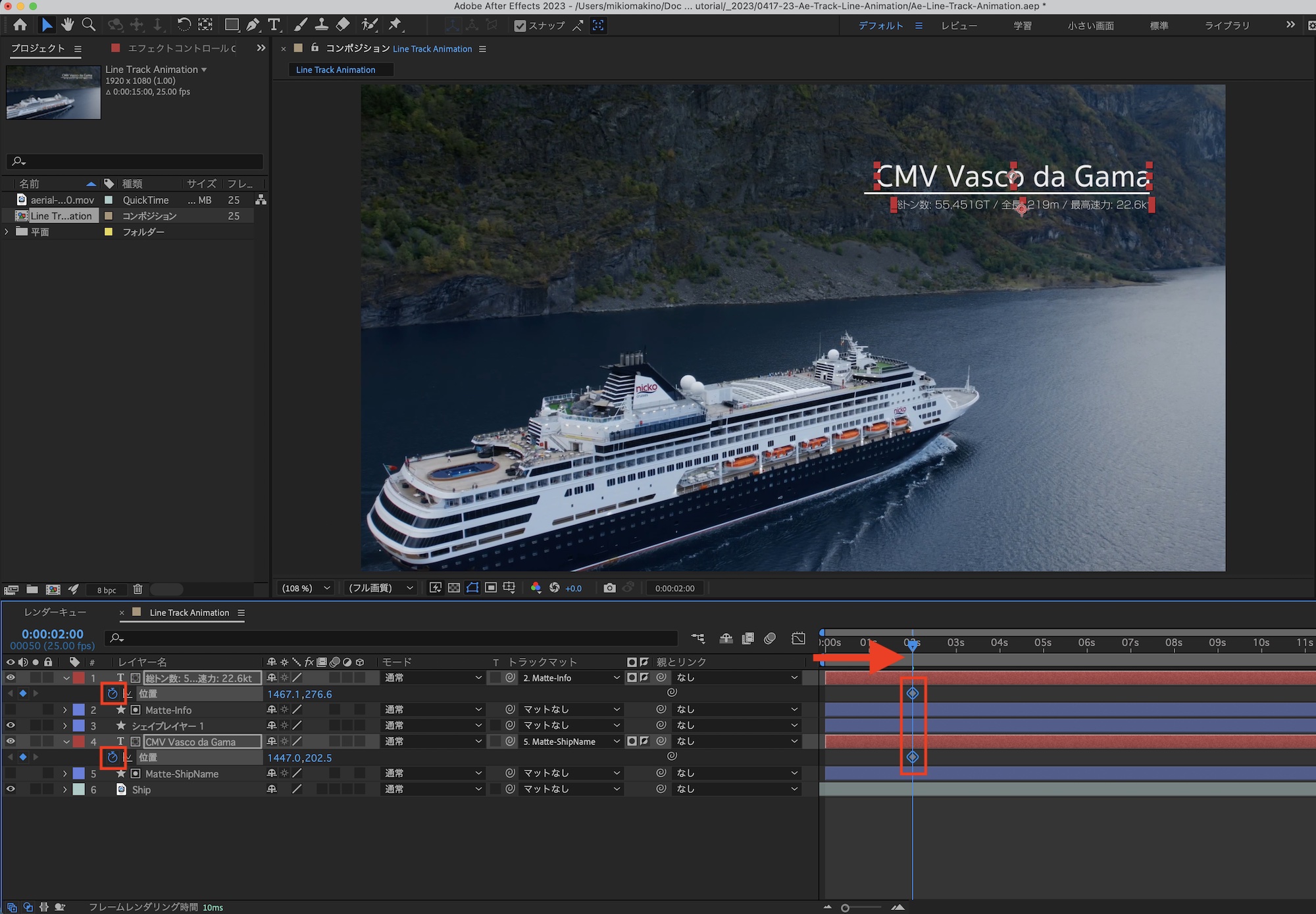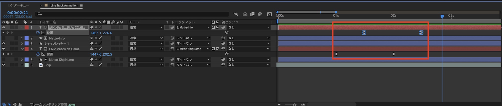デザインしたタイトルにアニメーションを追加します。船名は下から上に情報は左から右に現れるように、トラックマット用のシェイプを追加します。