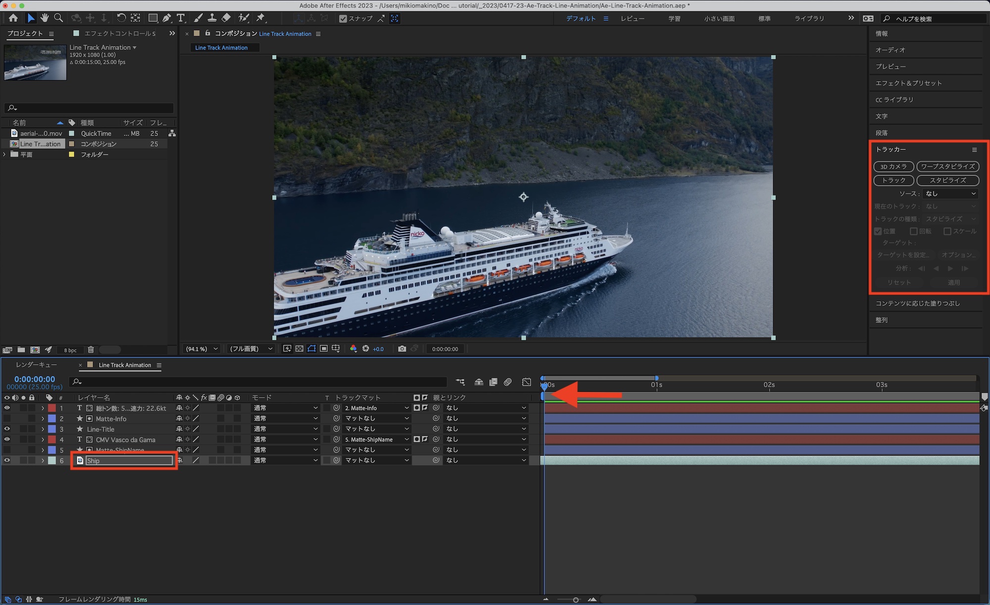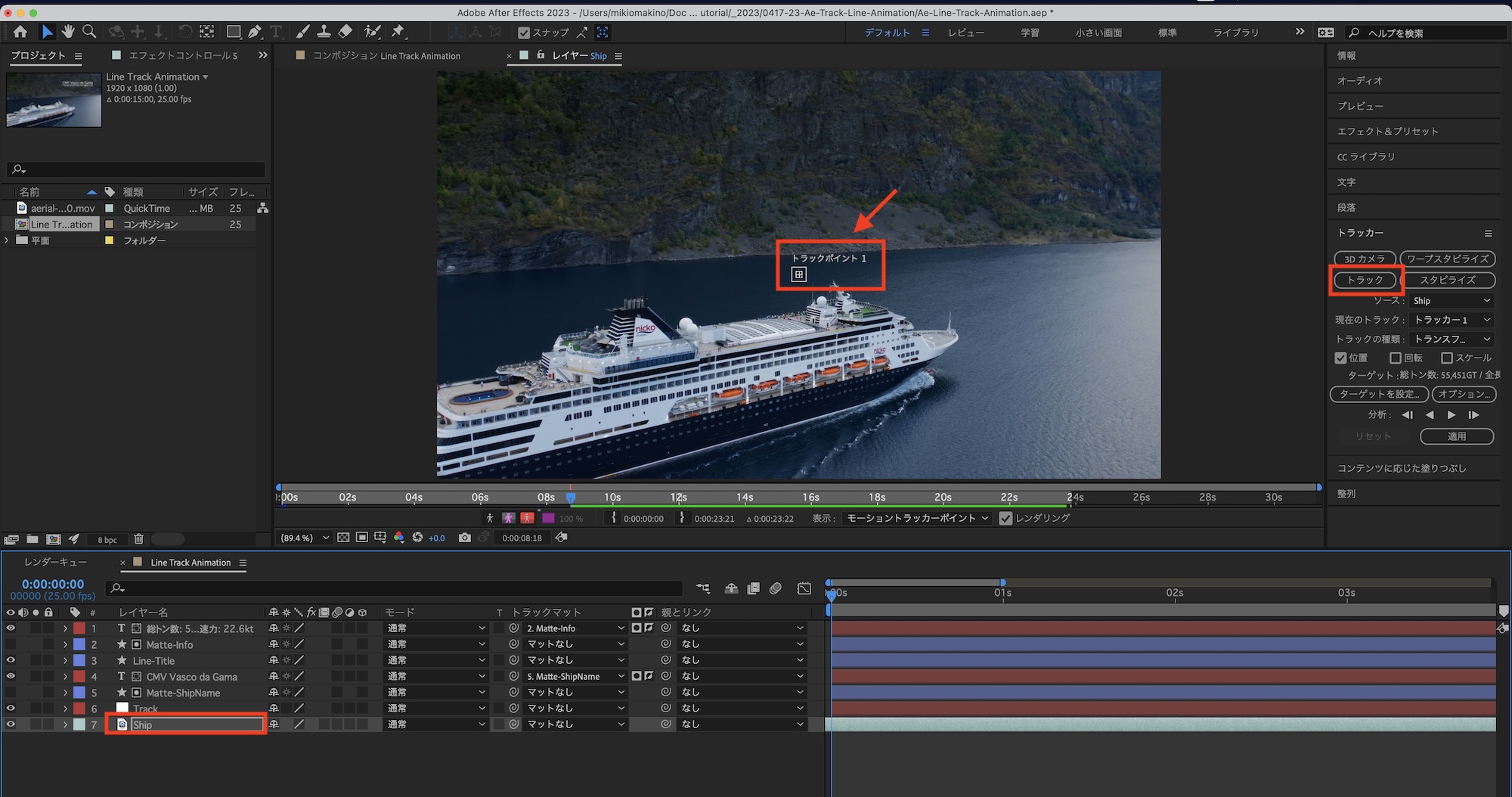 アニメーションで使用する線が船の動きに合わせて長さが変わるようにしたいので、クリップのトラッキングを行う必要があります。