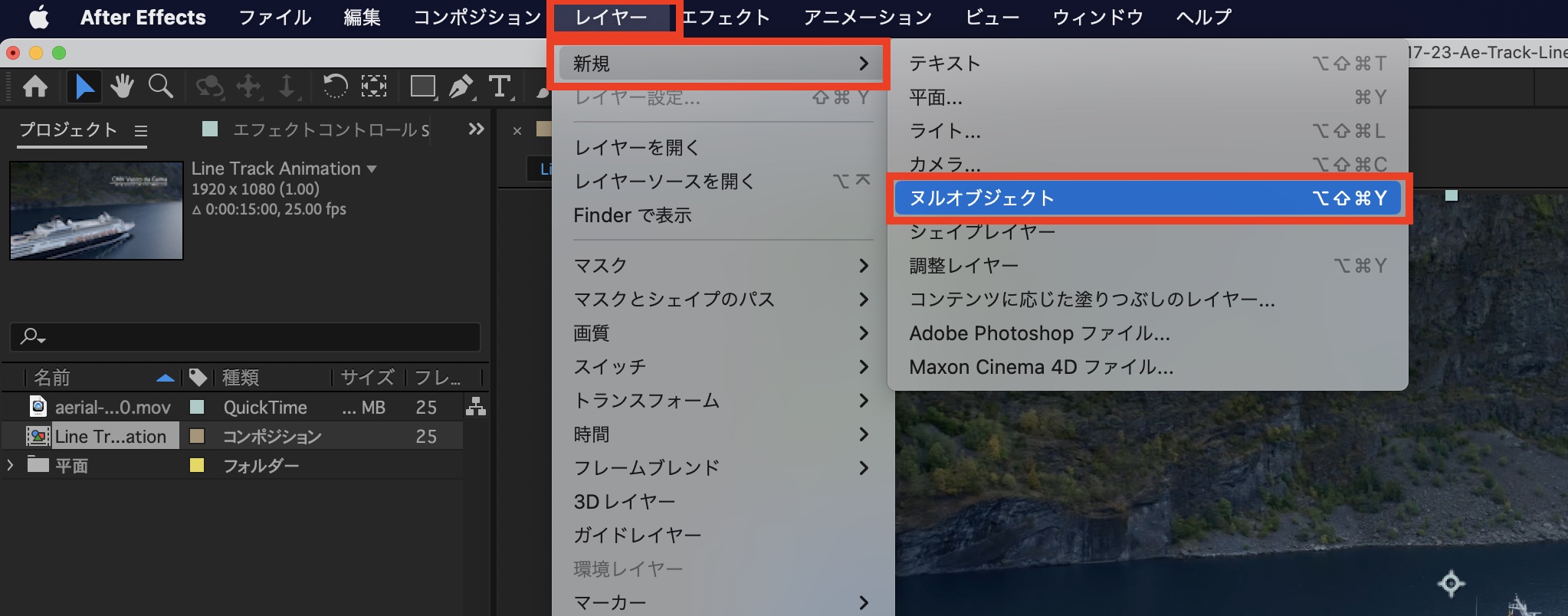 次に上部メニュー「レイヤー」、「新規」から「ヌルオブジェクト」をクリックしてヌルオブジェクトを追加し、トラックを行うクリップの上に配置します。名称は今回わかりやすく「Track」にしています。