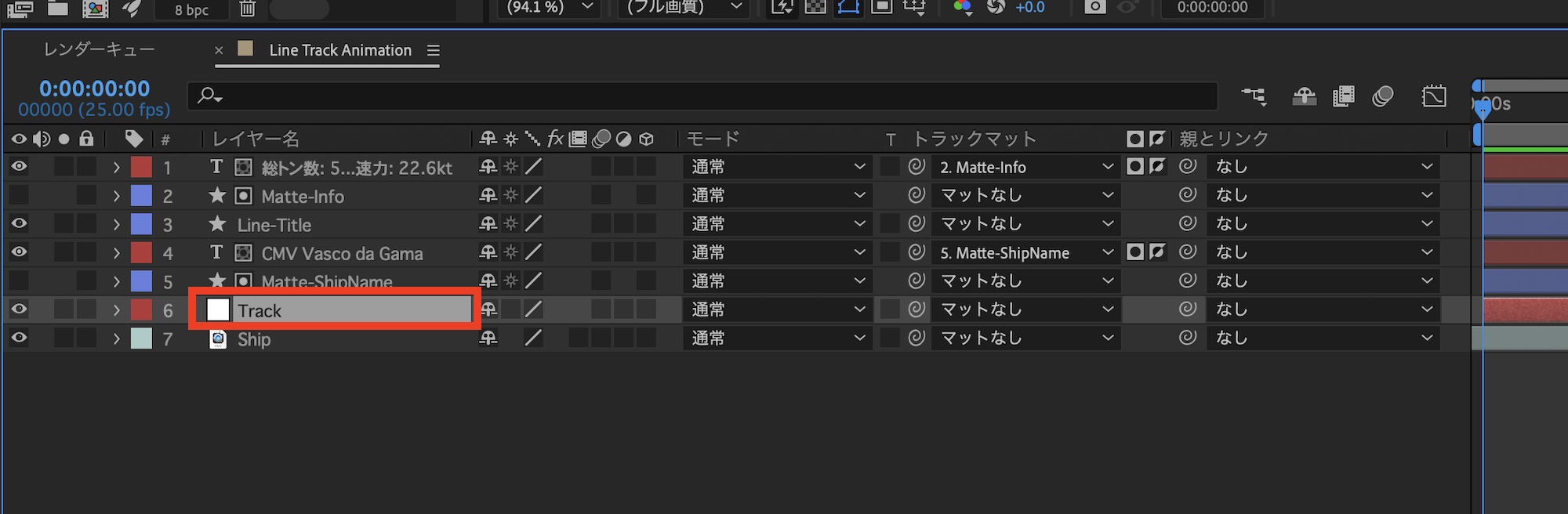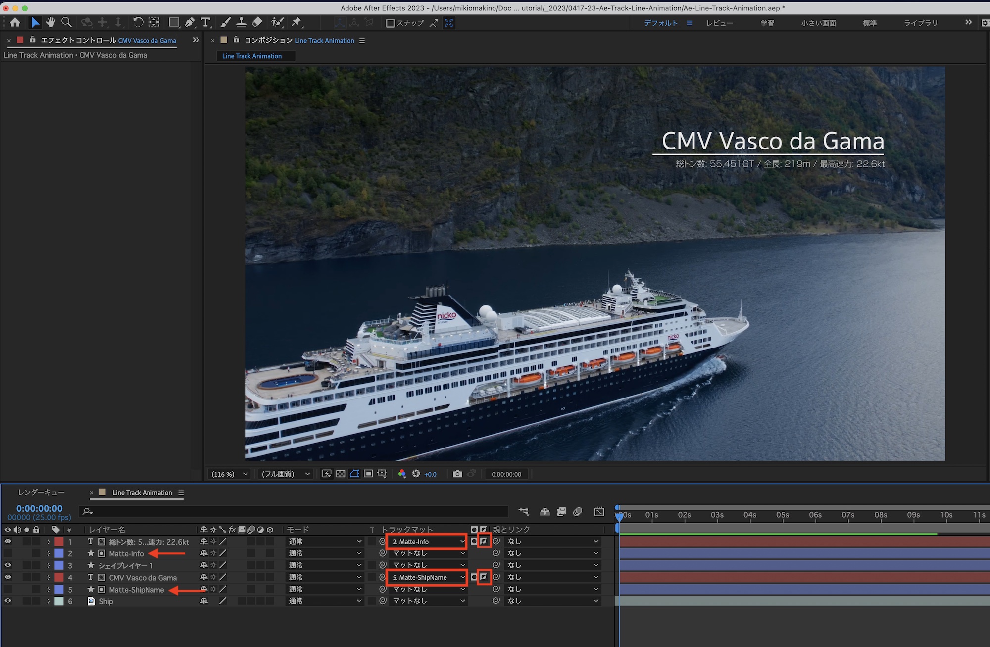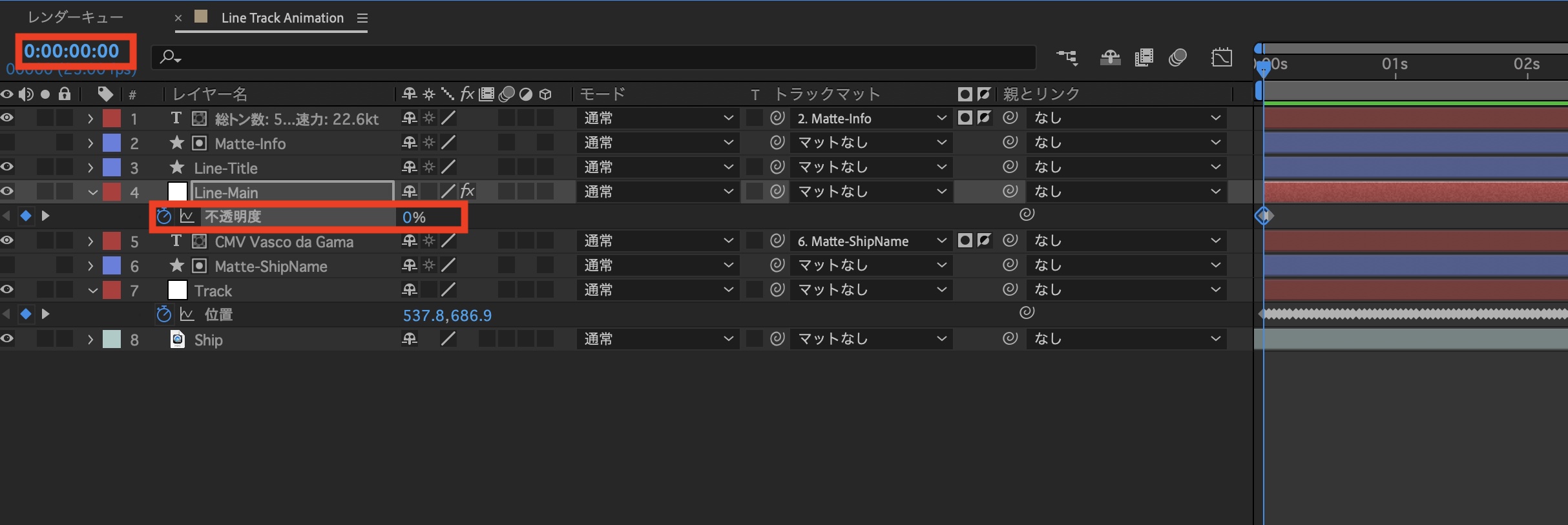 シェイプは「Matte-ShipName」、「Matte-Info」のようにわかりやすい名称に変更し、各テキストの下のレイヤーになるように配置します。その後でテキストレイヤーの「トラックマット」の項目から、それぞれ「Matte-ShipName」、「Matte-Info」を選択し、アルファ反転マットにします。