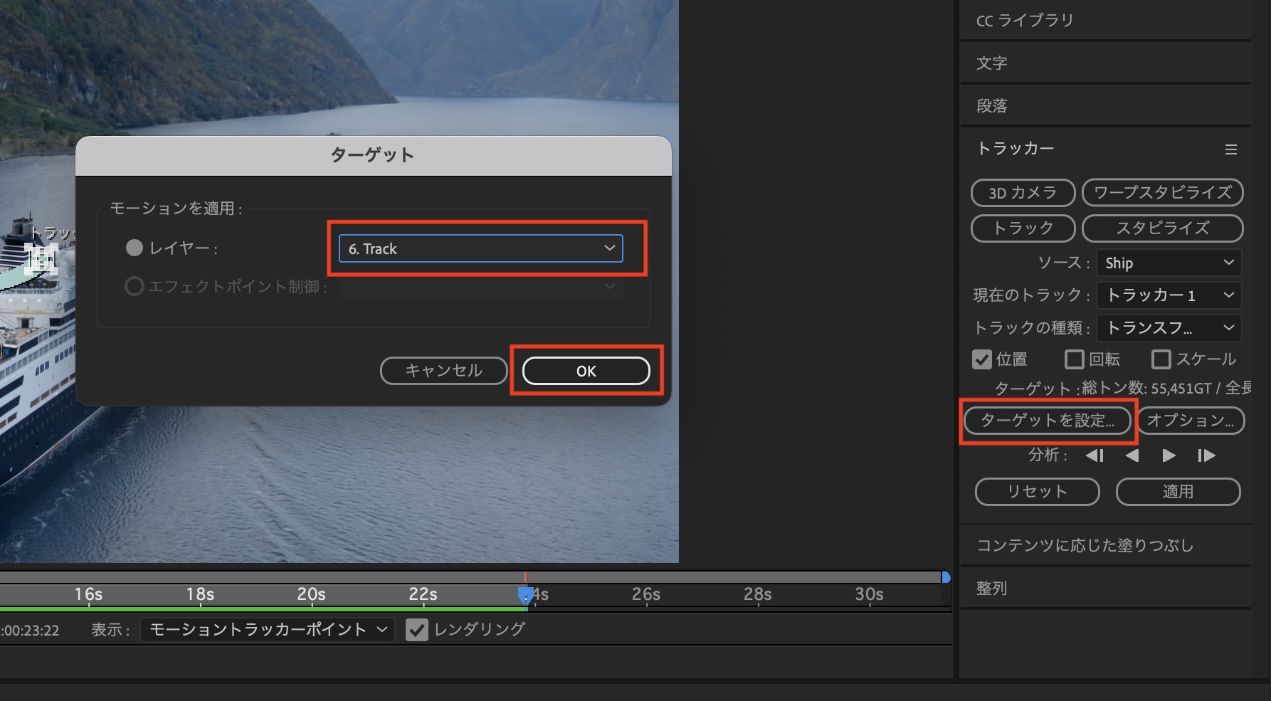 トラッキングが完了したら「ターゲットを設定」をクリックし、ヌルオブジェクトである「Track」を選択し、OKをクリックします。