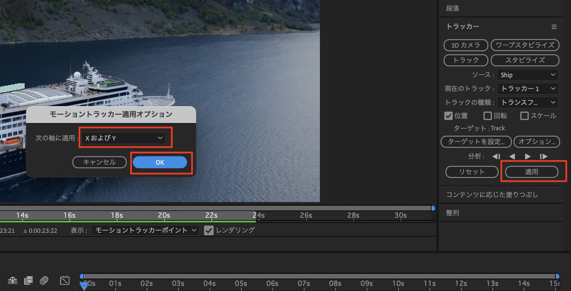 次に「適用」をクリックし、「次の軸に適用: XおよびY」が選択された上で「OK」をクリックし、トラッキングの結果をヌルオブジェクトに反映します。これでトラッキングの作業は完了です。