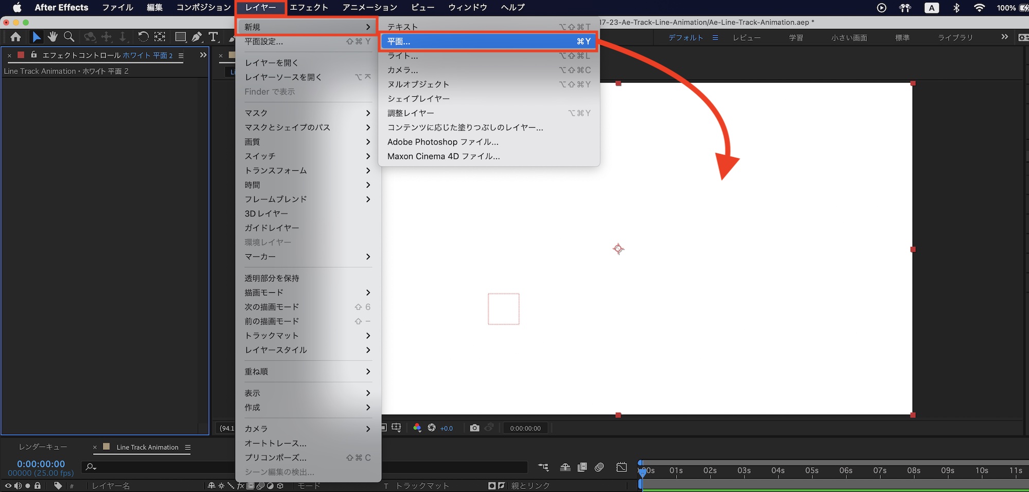 上部メニュー「レイヤー」、「新規」から「平面」を追加します。色は後で変更するので、特に気にしなくて大丈夫です。
