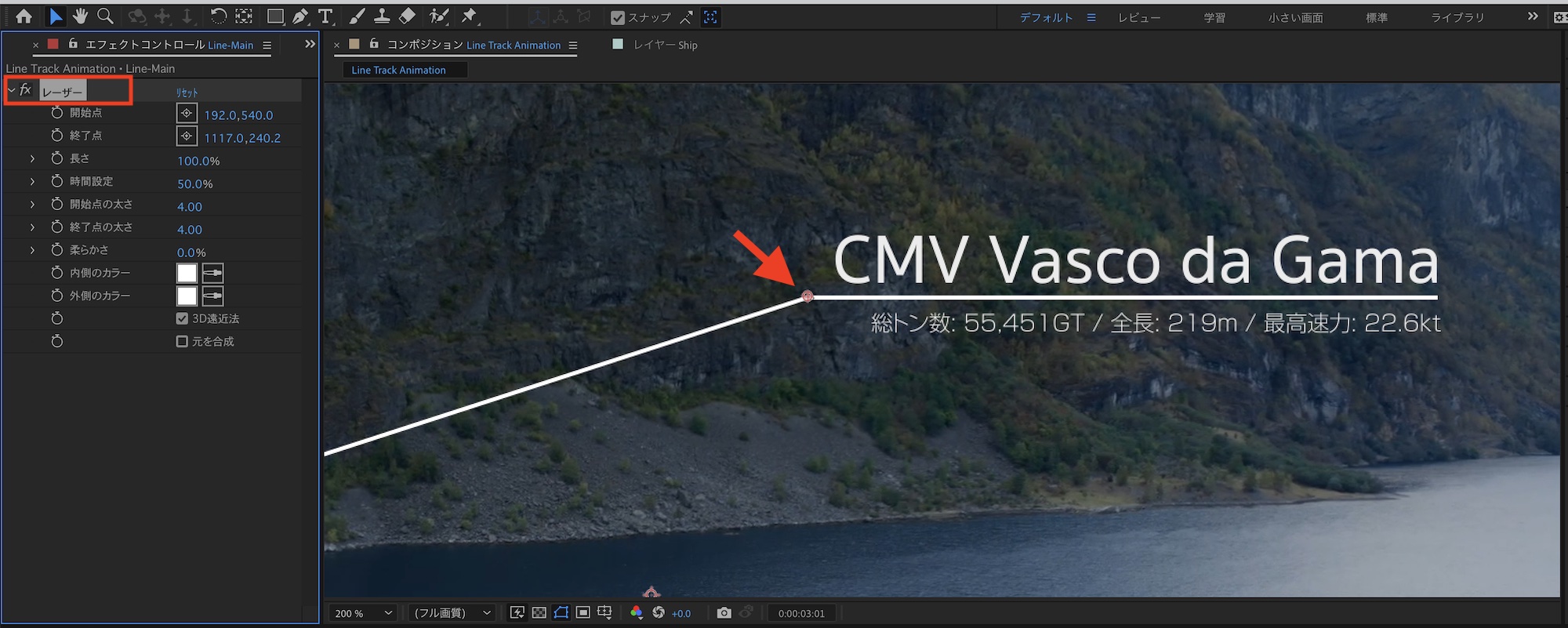 テキストのアニメーションが完了する「3秒」にタイムインジケータを動かし、「Line-Main」の「レーザー」の中にある「終了点」の位置アイコンをクリックし、テキストの線と繋がるように調整します。
