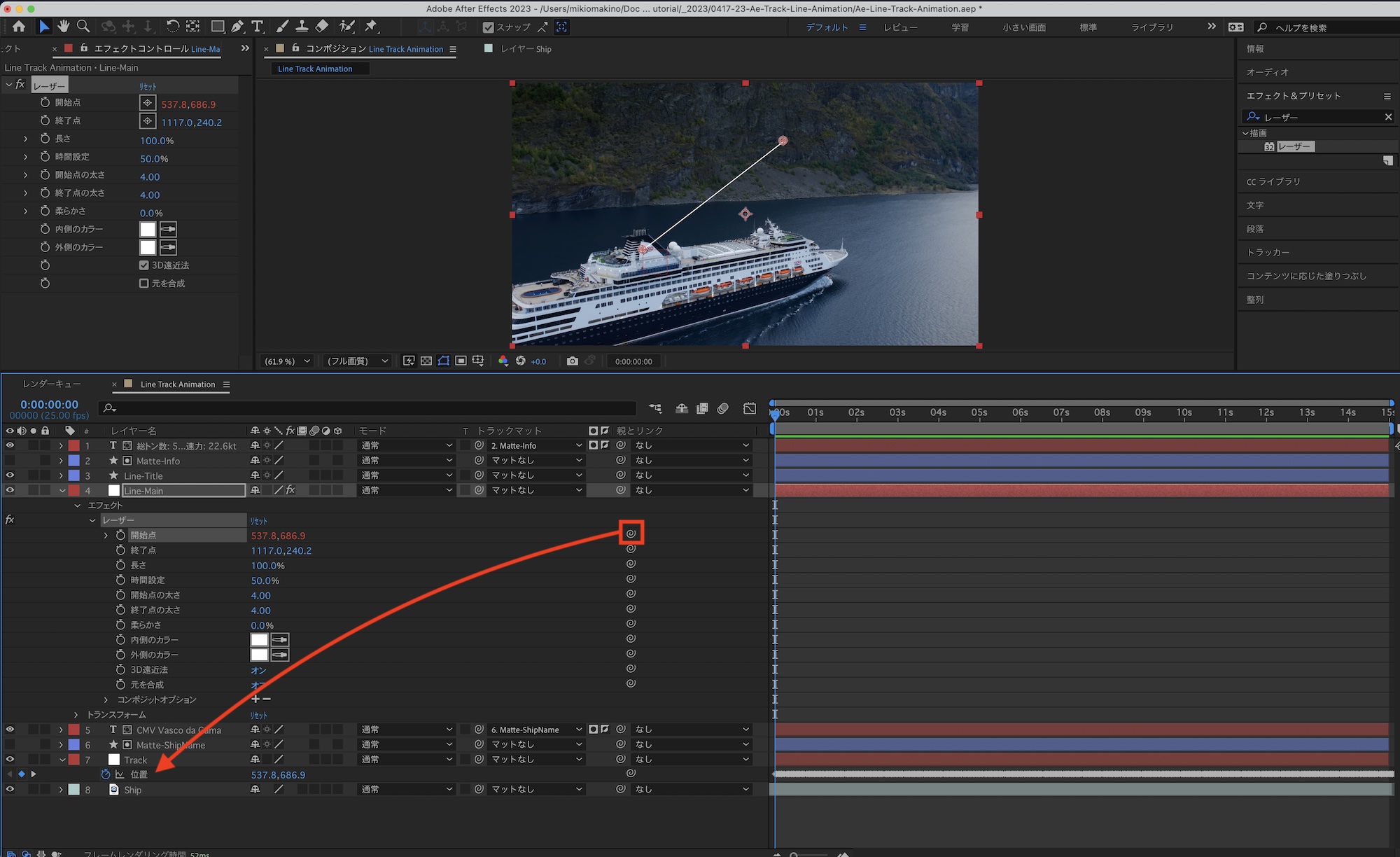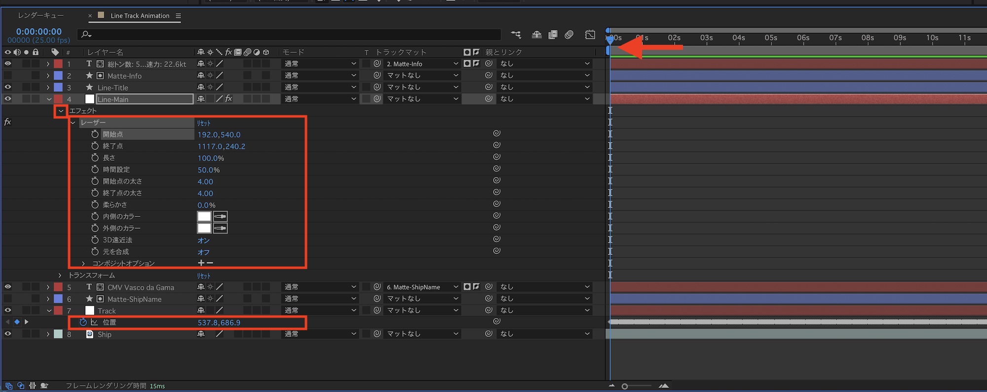 次は「開始点」の調整です。タイムインジケータを「0秒」に動かし、タイムラインで「Track」の「位置」と「Line-Main」のエフェクト「レーザー」のパラメータを表示します。