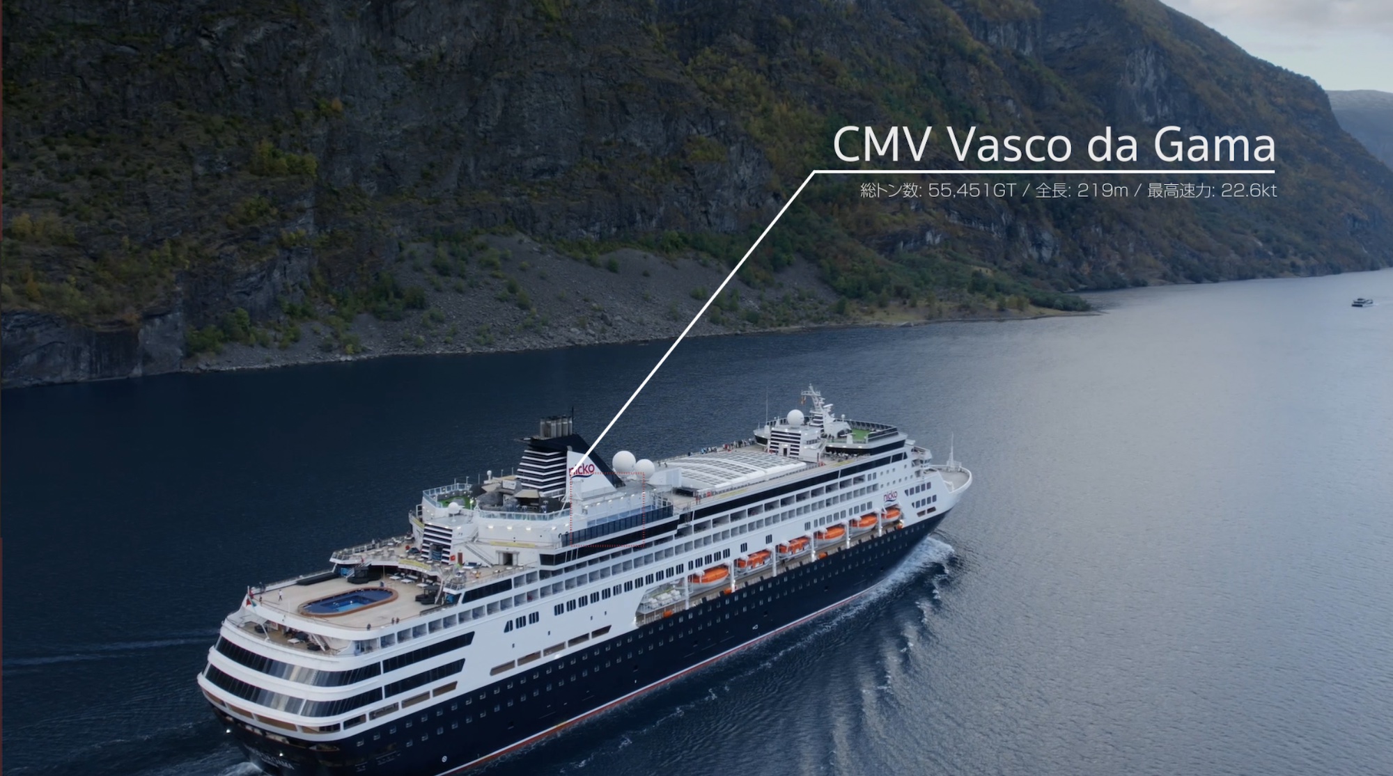 今回はシンプルに中央に線を配置し、上部に船名を下部に総トン数、全長、最高速力などいった簡単な情報を配置しました。