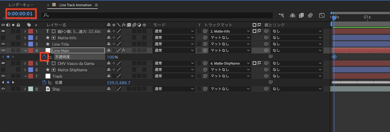 「Line-Main」の不透明度(T)のパラメータを開き、「1フレーム」に移動しストップウォッチアイコンをクリックしてキーフレームを追加し、「0秒」は「0%」にしてフェードインのアニメーションを加えます。