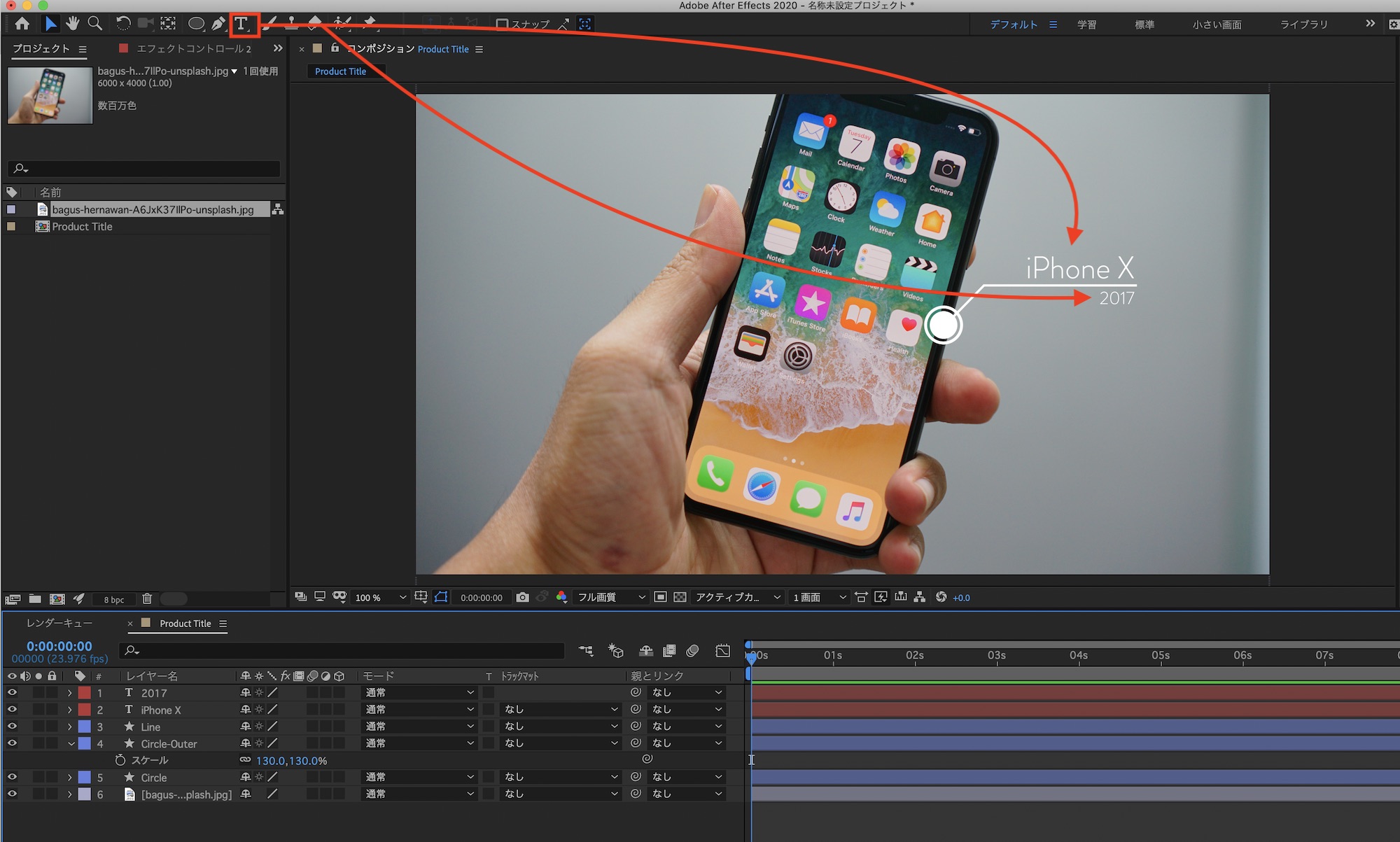 次はテキストツールを使ってタイトルを追加していきます。今回のプロジェクトでは商品名と発売年を表示させたいので、「iPhone X」、「2017」の2つのテキストを追加して表示させたい位置に配置しました。
