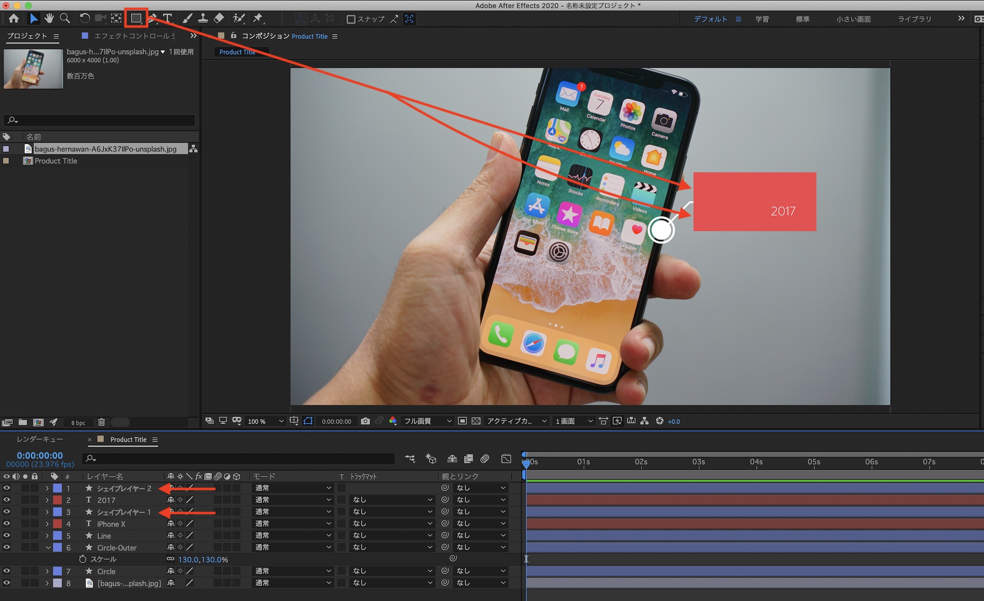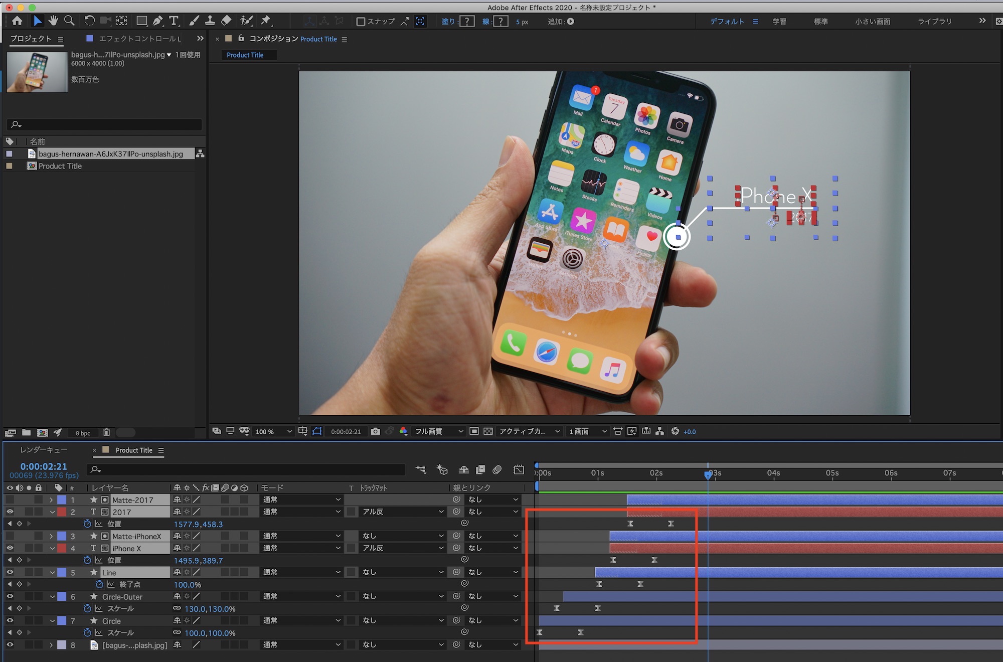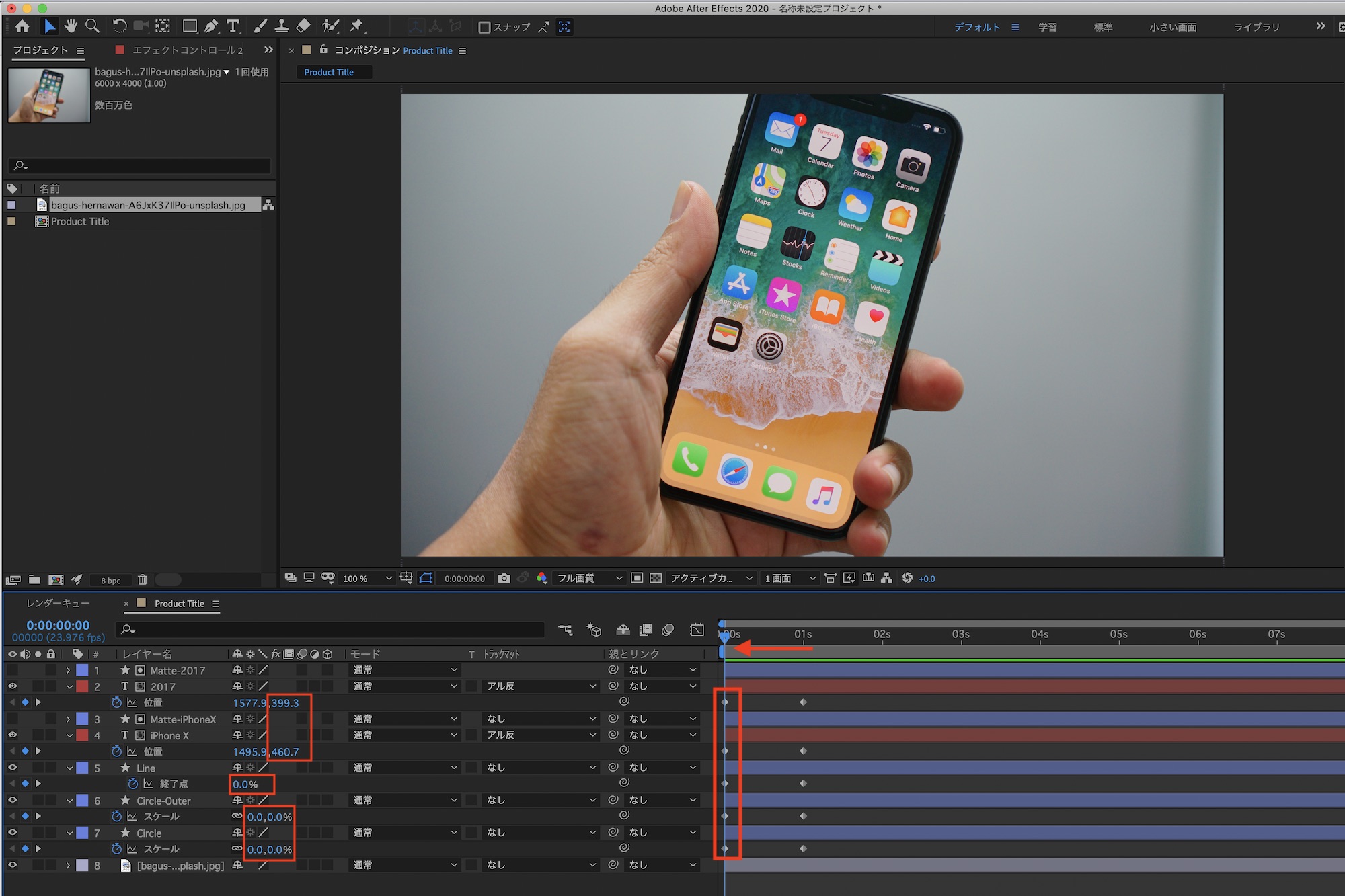 タイムインジケーターを「0秒」に動かし「Circle」、「Circle-Outer」のスケールを「0%」、「Line」の終了点を「0%」に変更し、「iPhone X」は下から、「2017」のテキストは上から現れるように位置のY軸を変更しキーフレームを追加します。