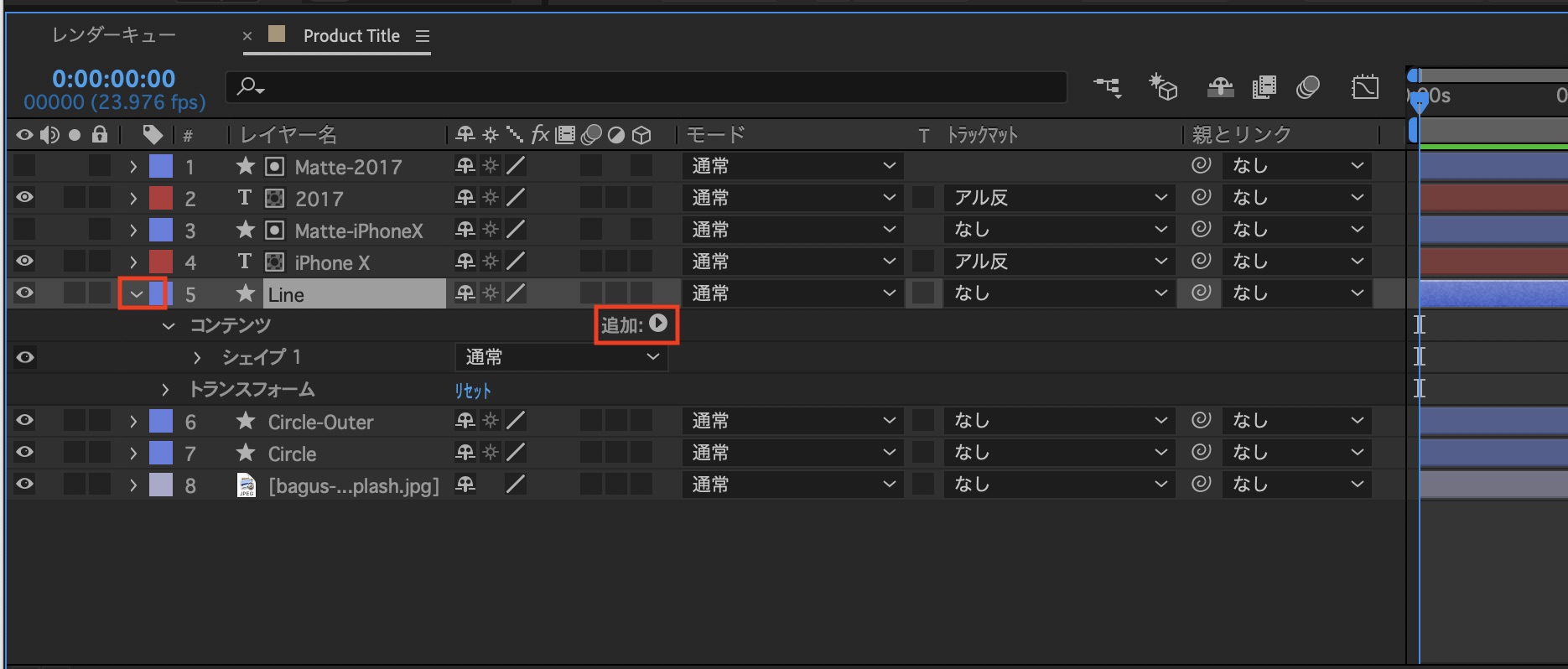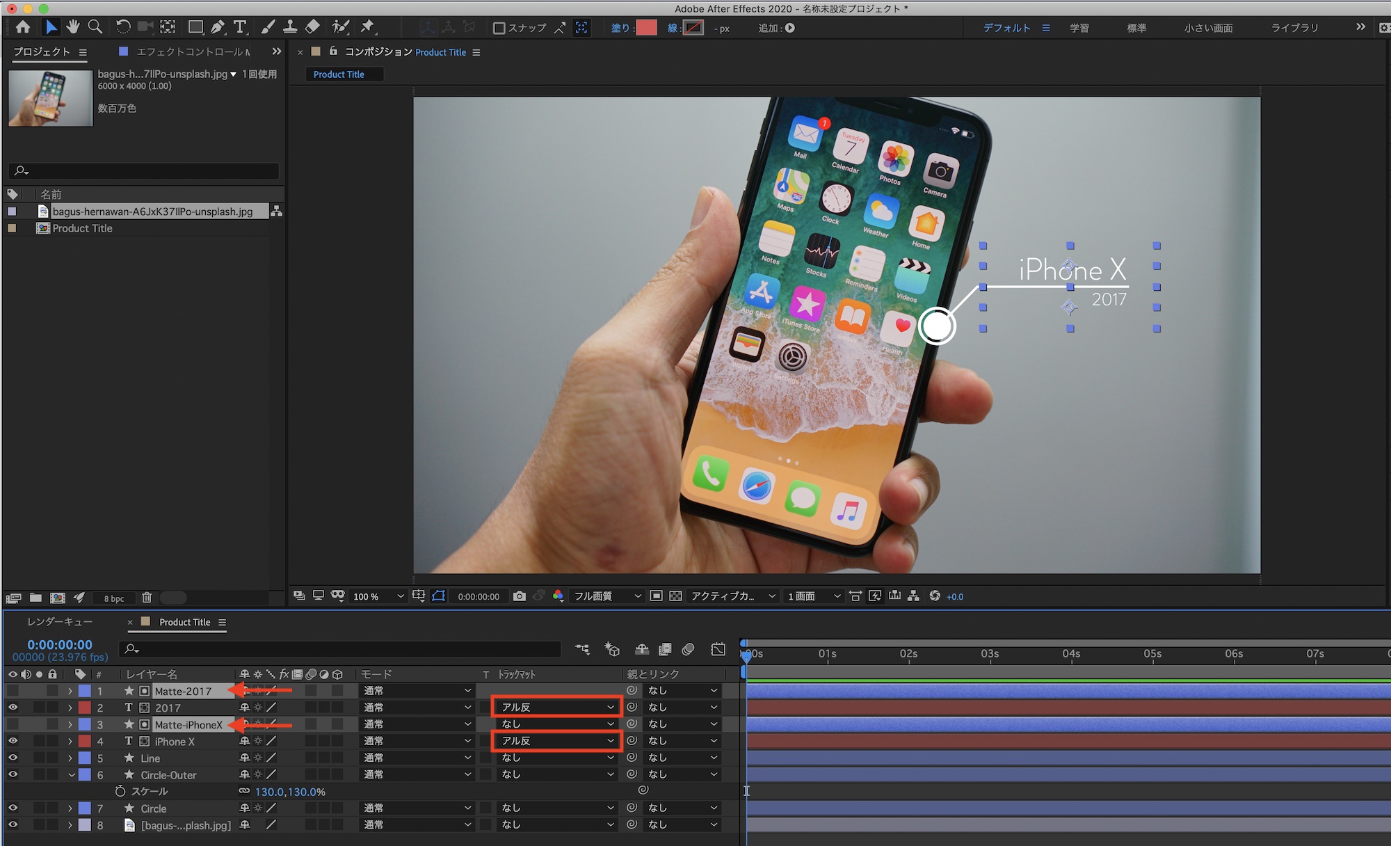 追加したシェイプは「Matte-iPhoneX」、「Matte-2017」のようにレイヤー名を変更し、各テキストレイヤーのトラックマットの項目から「アルファ反転マット」を設定します。