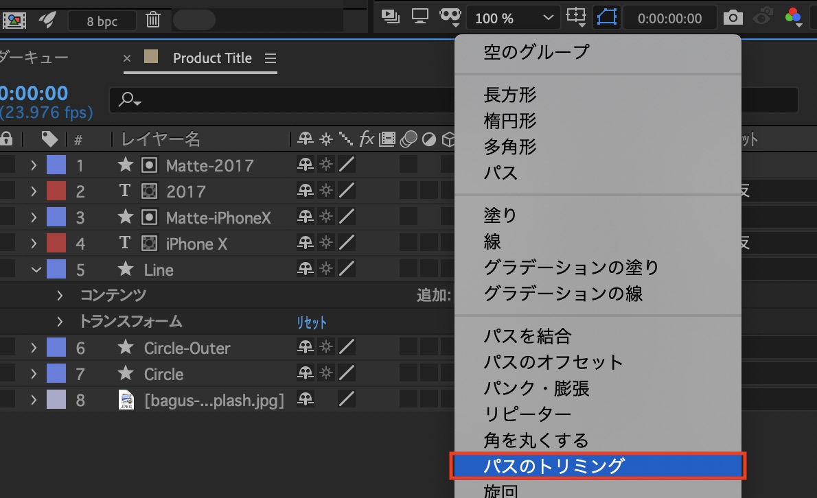 シェイプとテキストなどにそれぞれキーフレームを追加していきます。まず、「Line」レイヤーの三角アイコンをクリックして「追加」から「パスのトリミング」を選択します。
