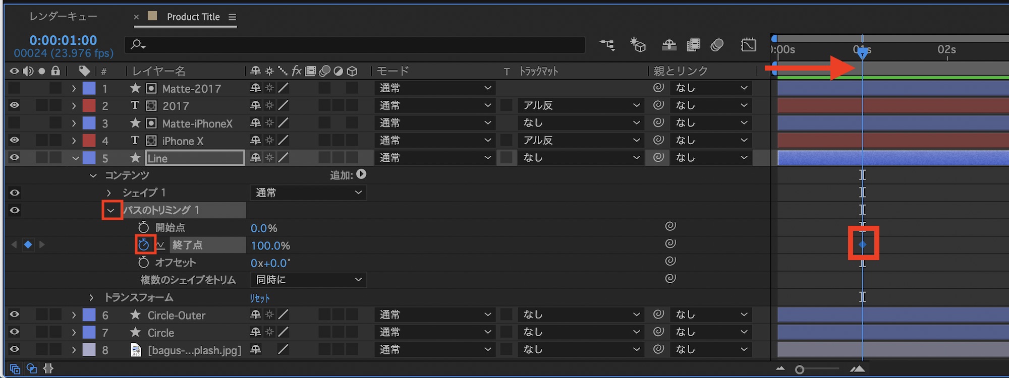 タイムインジケーターを「1秒」に動かし「パスのトリミング」を展開しして、「終了点」のストップウォッチアイコンをクリックしてキーフレームを保存します。