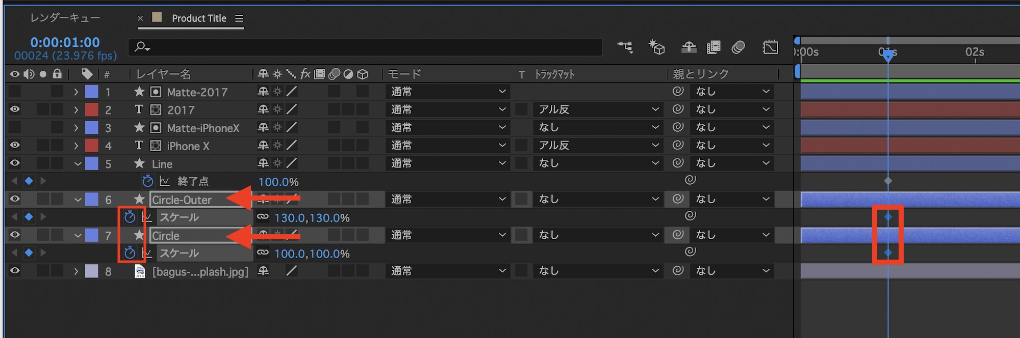 次に「Circle」と「Circle-Outer」の「スケール」を開きストップウォッチアイコンをクリックしてキーフレームを追加。
