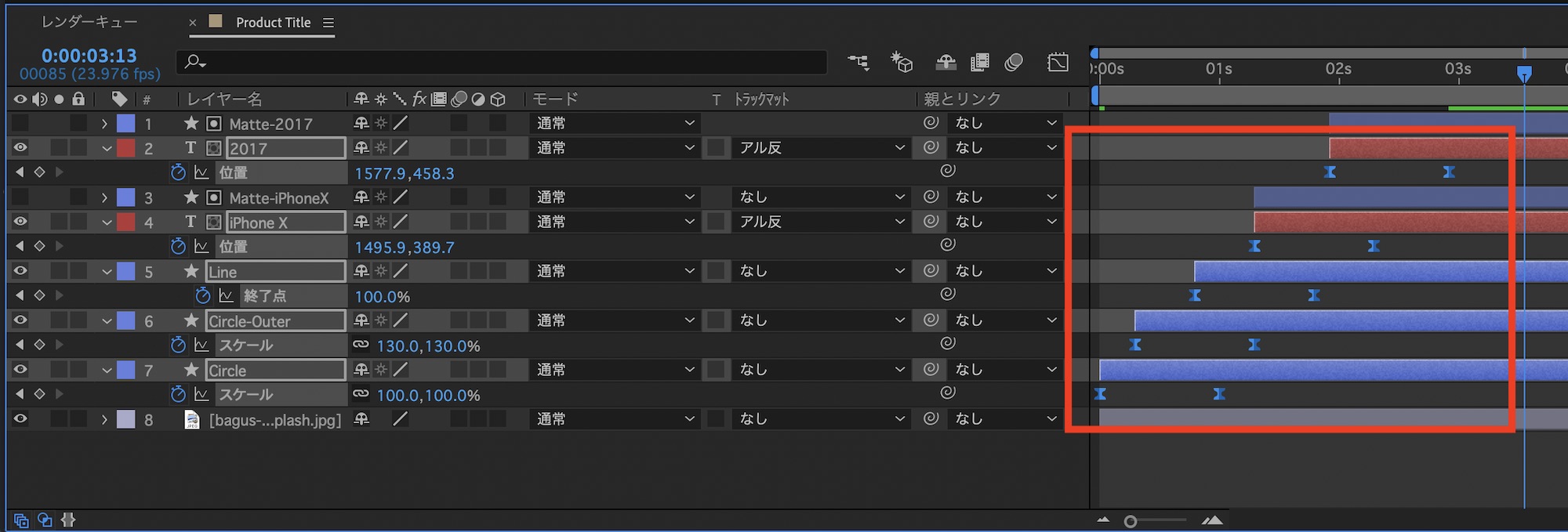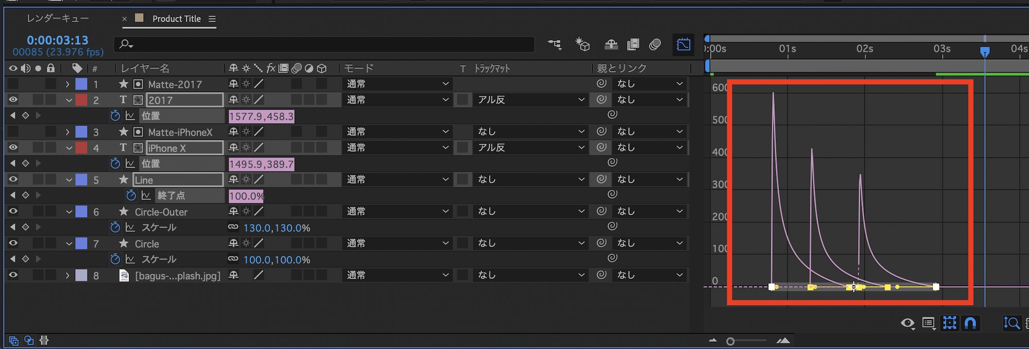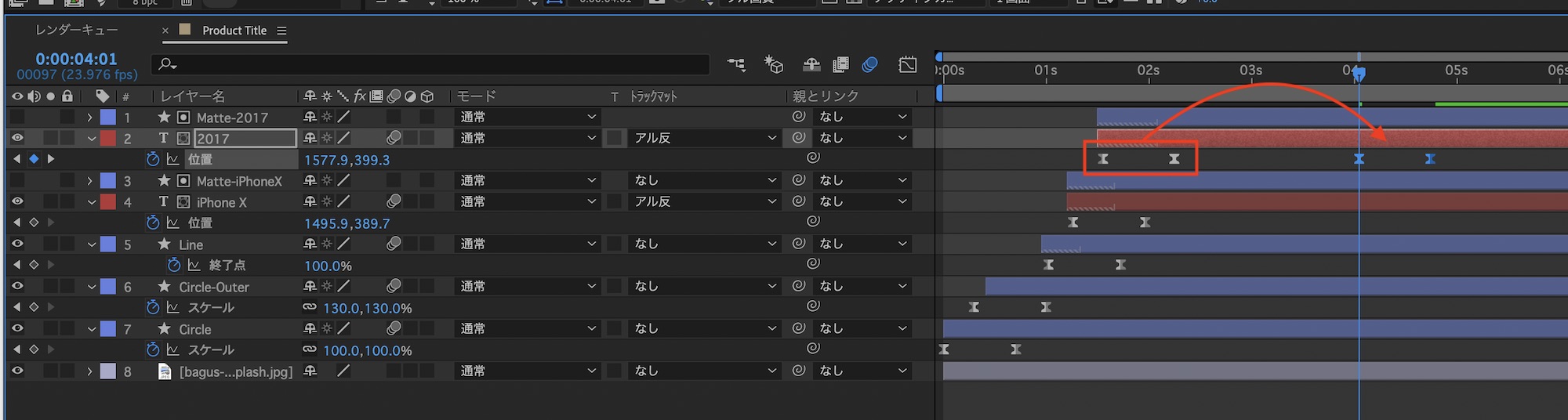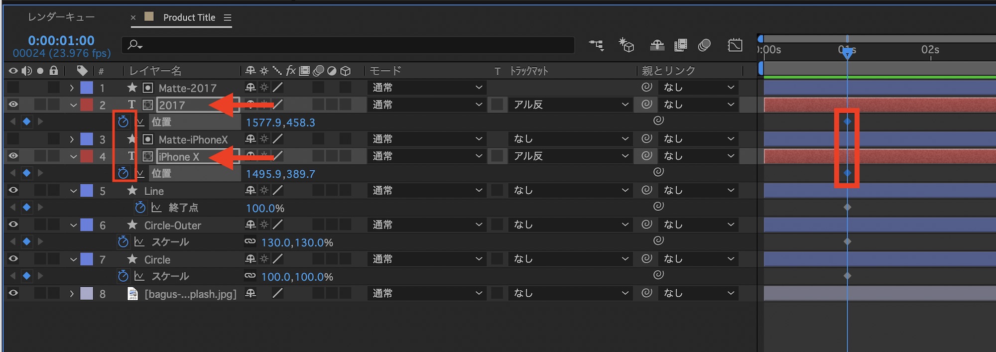 「iPhone X」と「2017」のテキストレイヤーは「位置」のプロパティを展開し、ストップウォッチアイコンをクリックしてキーフレームを保存します。