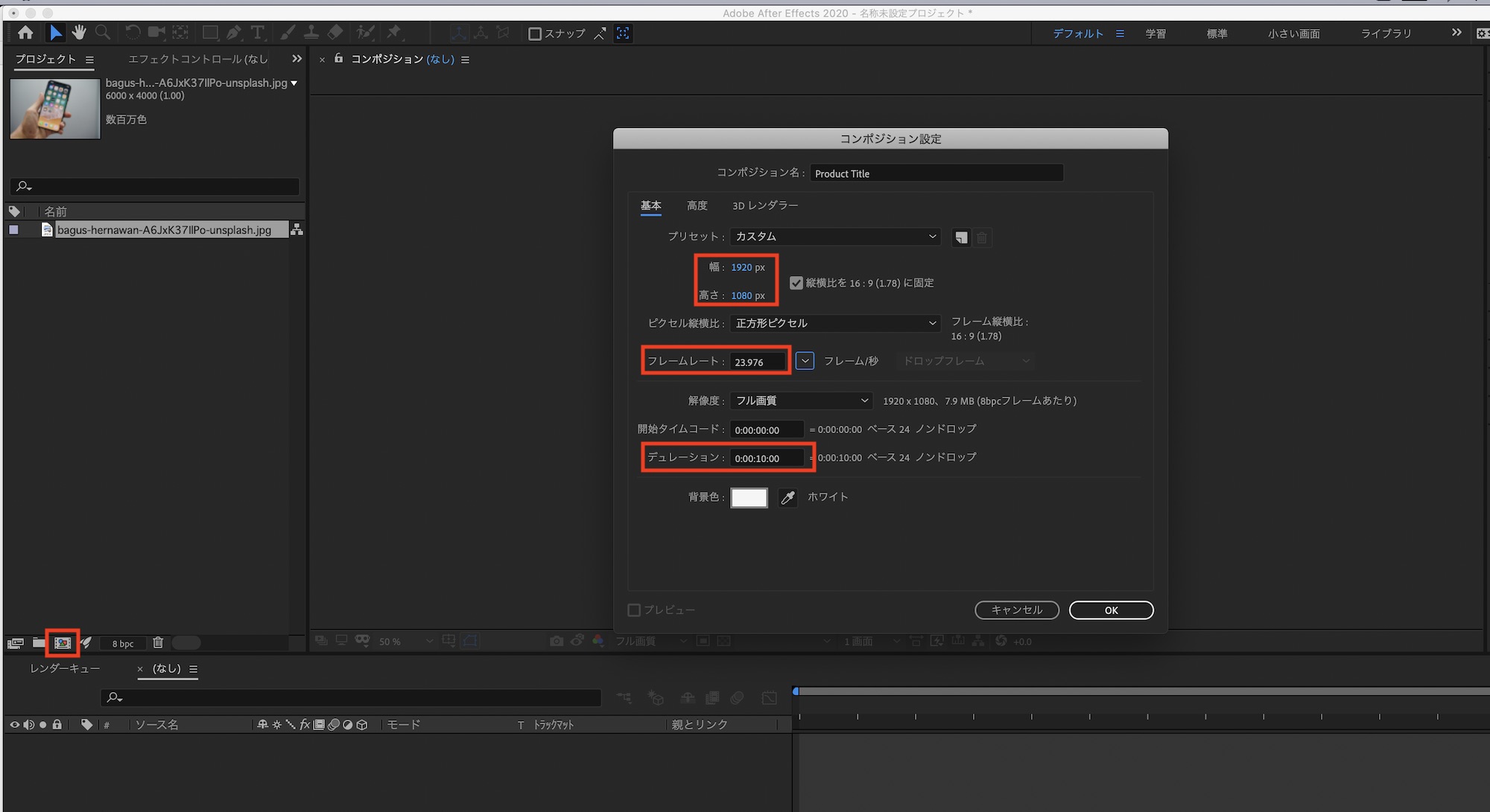 その後で新規コンポジションを作成し、設定を「1920x1080」の「フレームレート:23.976」、「デュレーション:10秒」にします。設定はプロジェクトに合わせて変更すると良いでしょう。