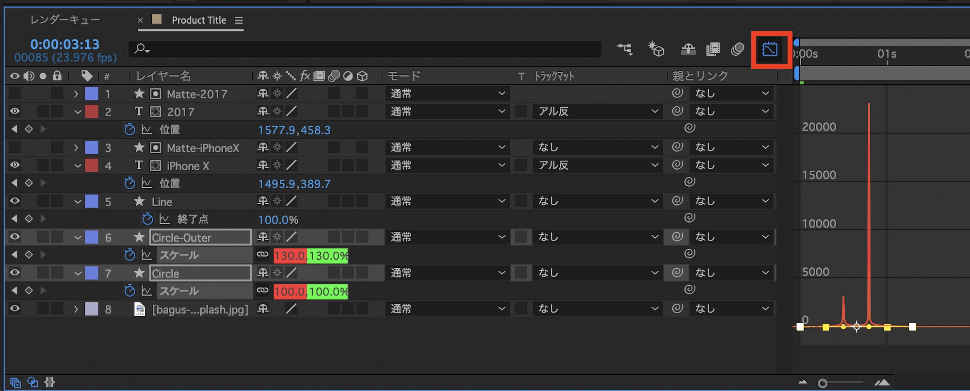 必要に応じてグラフエディタを使ってキーフレームのスピードの調整を行います。筆者は「Circle」、「Circle-Outer」は中心がピークを迎えるようにしました。