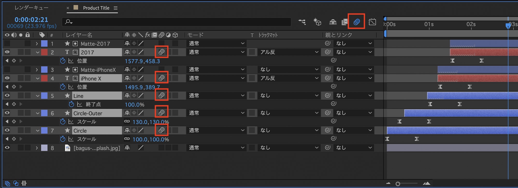 最後はモーションブラーのオプションをクリックしてキーフレームを追加したレイヤーにモーションブラーを追加します。