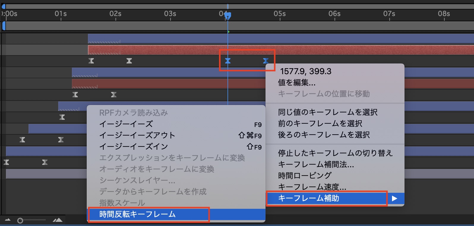 複製されたキーフレームを選択して右クリック「キーフレーム補助」から「時間反転キーフレーム」を選択して、キーフレームを反転させます。