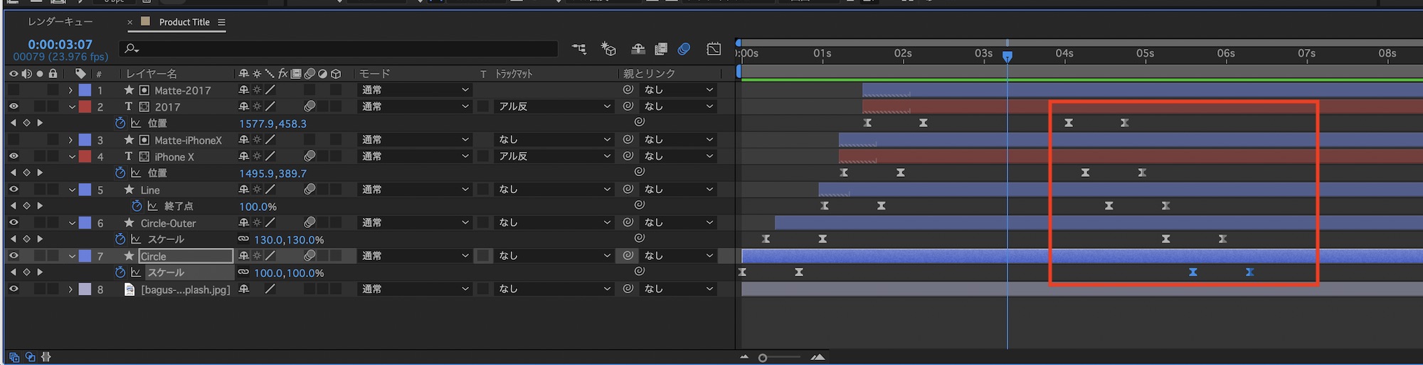 今のままだと各レイヤーのアニメーションが一斉にスタートしてしまうので、「Circle」、「Circle-Outer」、「Line」、「iPhone X」、「2017」の順番で現れるようにレイヤーをずらしていきます。