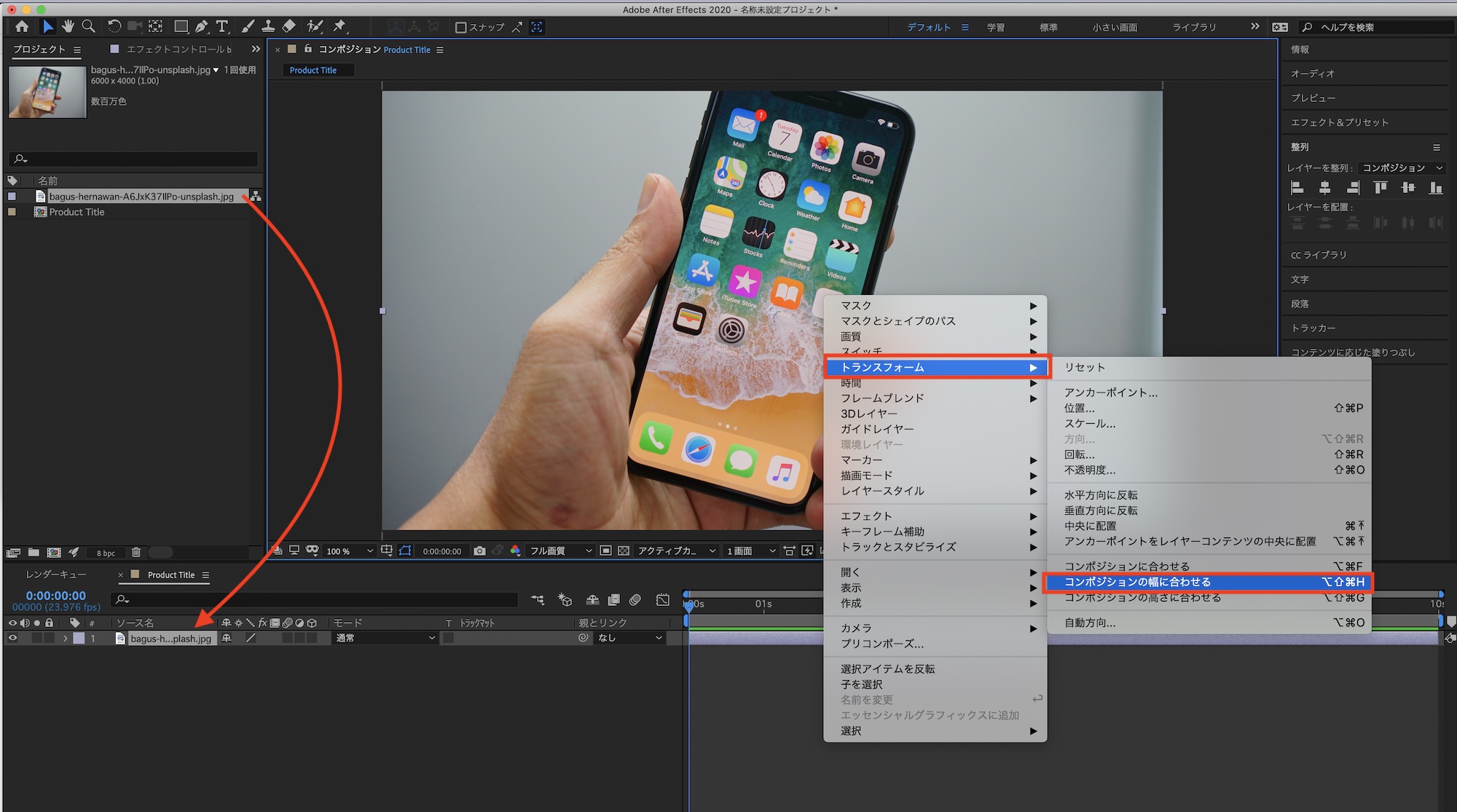 読み込んだ画像をタイムラインに追加します。今回は写真を使用しているので右クリック「トランスフォーム」から「コンポジションの幅に合わせる」を選択してサイズを調整します。